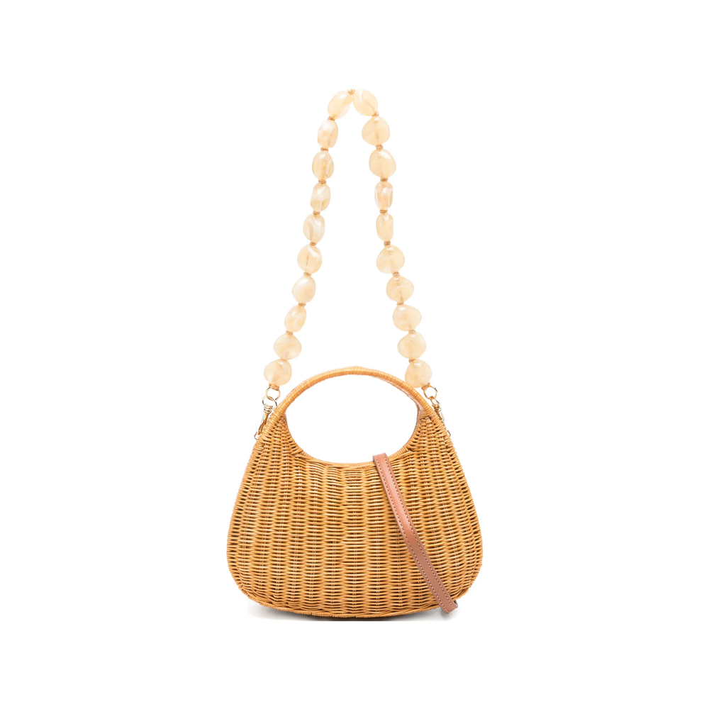 beige woven design bead embellishment top handle shoulder strap slip pocket