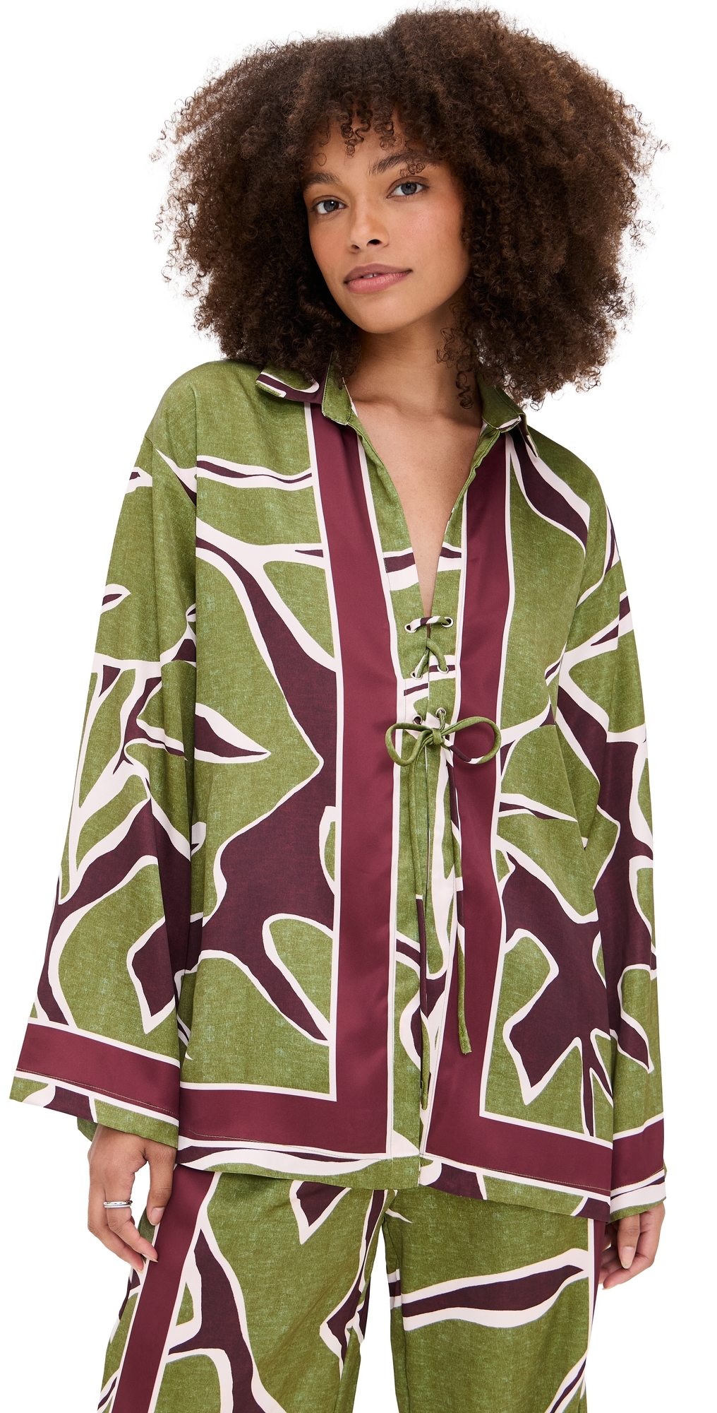 Fabric: Mid-weight, non-stretch satin. Abstract print. Collared neck. Long sleeves. Lace-up at front. Shell: 100% polyester. Wash cold. Imported, China. Measurements: Measurements from size XS Length: 27.5in / 70.0cm, from shoulder
