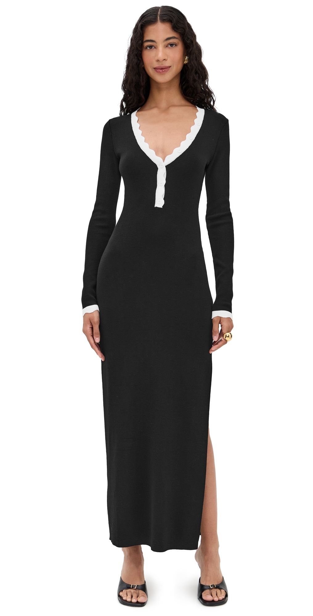 Fabric: Mid-weight stretch knit. Contrast scalloped trim. Thigh-high side slit. Maxi length. V neck. Long sleeves. Partial button placket. Shell: 89% viscose/11% nylon. Unlined. Hand wash. Imported, China. Measurements: Measurements from size XS Length: 55.5in / 141.0cm, from shoulder to front hem