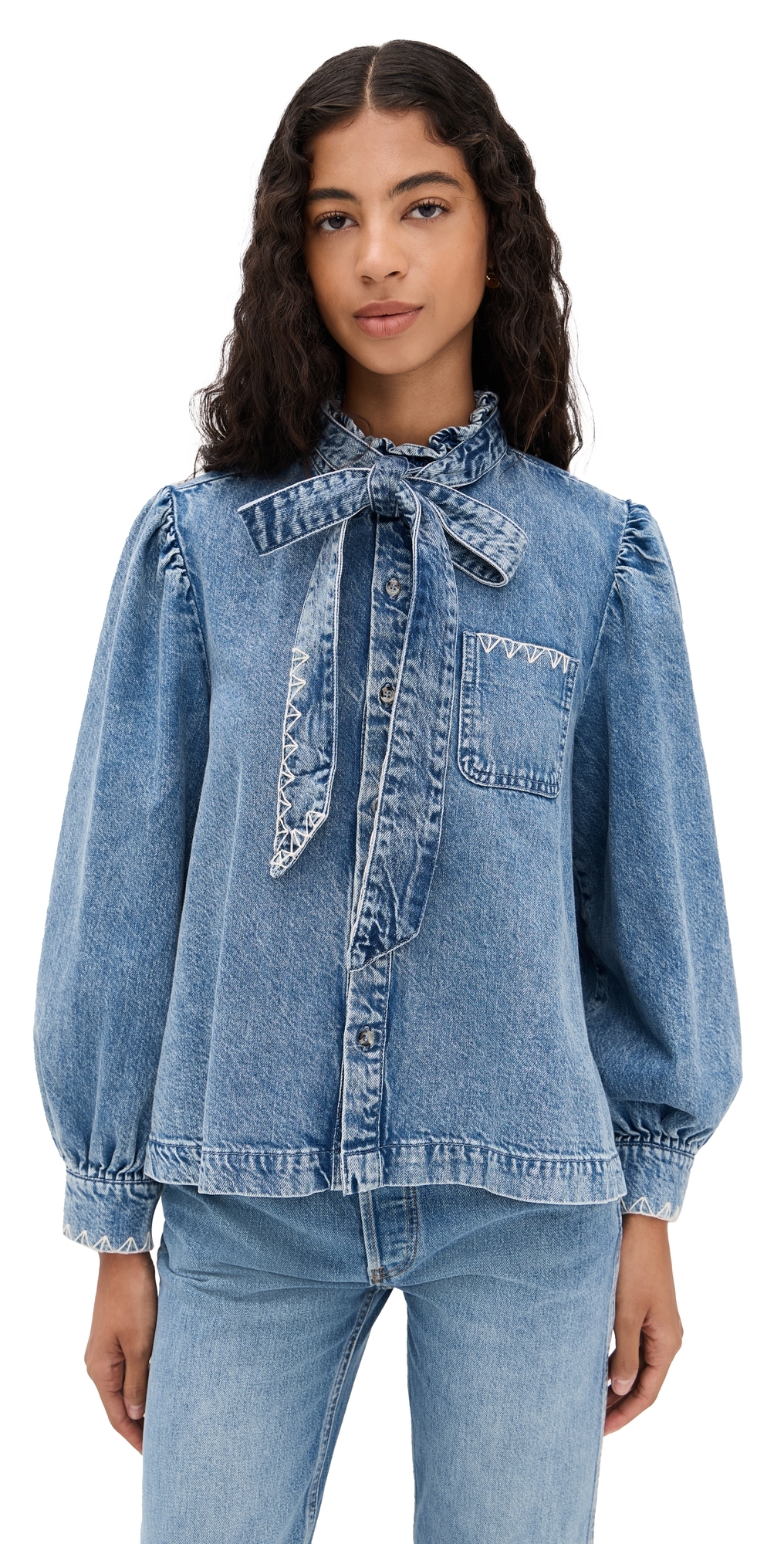 Fabric: Mid-weight, non-stretch denim. Composed of 5% recycled cotton. Whipstitch fan trim. Removable tie and ruffled trim at neckline. Button cuffs. Collared neck. Long puff sleeves. Button placket. Patch breast pocket. Shell: 100% cotton. Wash cold. Imported, Pakistan. Measurements: Measurements from size XS Length: 23.5in / 60.0cm, from shoulder