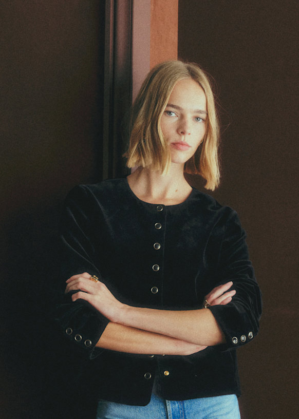 SEZANE Marlys Jacket Black Velvet worn by Leia Sfez | Leia Sfez Outfits and Style SEZANE