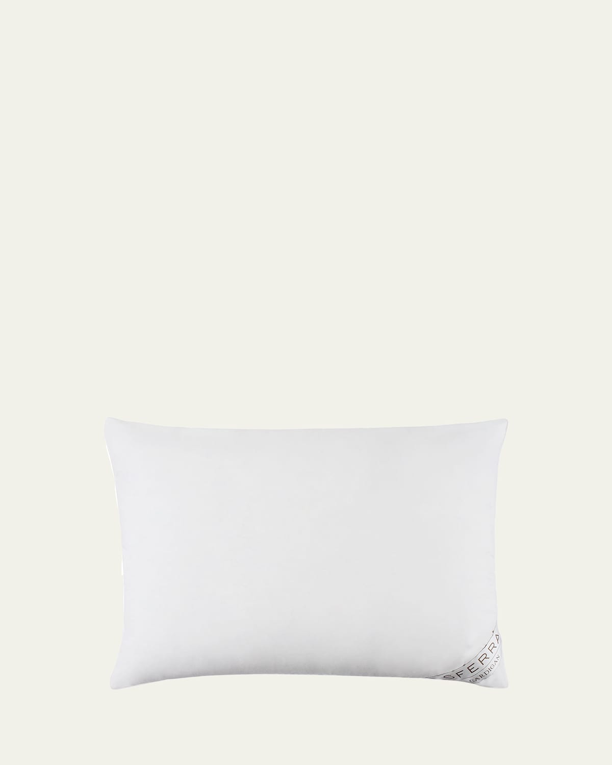 Pillow with piped edging. 345thread count Germanwoven cotton batiste. European white goose down. 15" baffle box construction. 800+ fill power. Corner loops and silks. 18ounce fill. 20" x 36". Machine wash. Made in the USA.