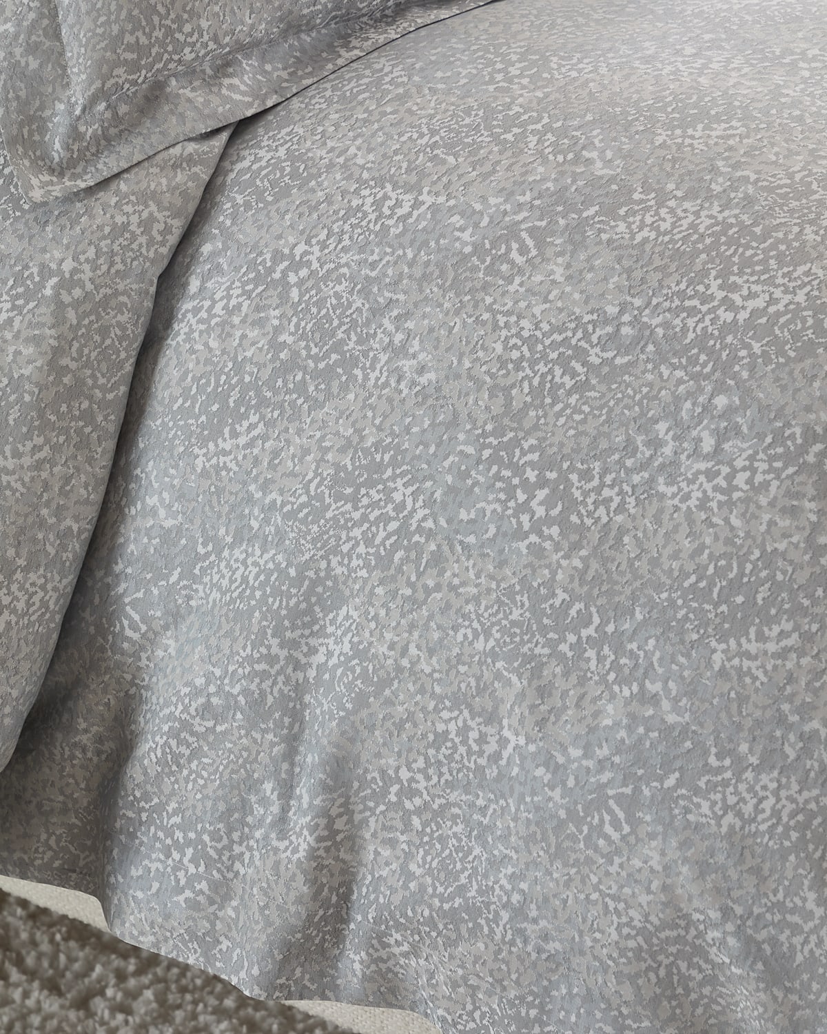 The spellbinding beauty of Bione draws inspiration from the aesthetic variance of natural materials and minerals. This exquisite yarndyed sateen jacquard showcases a rich textural pattern that gracefully unfolds across an elegant palette of slate blue, taupe, and grey. Each thread weaves a tale of sophistication, inviting you to explore its tactile allure. Crafted of longstaple cotton Softly textured hand feel Approx. 88"L x 92.0"W Machine wash warm water on gentle cycle; tumble dry on low heat Do not use bleach as it may weaken fabric and cause yellowing Made in Italy