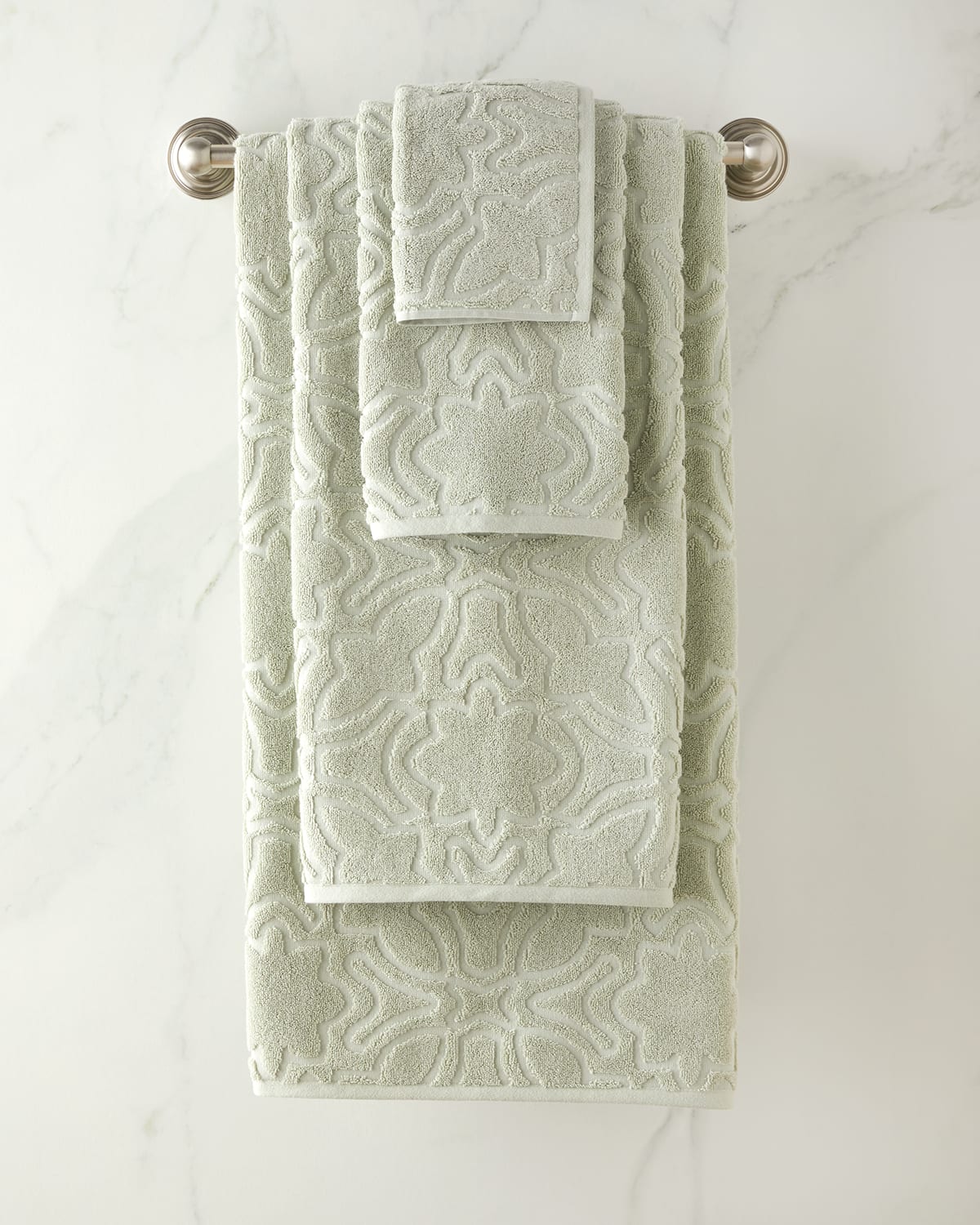 Hand towel is made of combed cotton Features a jacquard motif Approx. 30"L x 20"W Sold individually Machine wash cold, line dry, iron on "linen" setting Made in Portugal