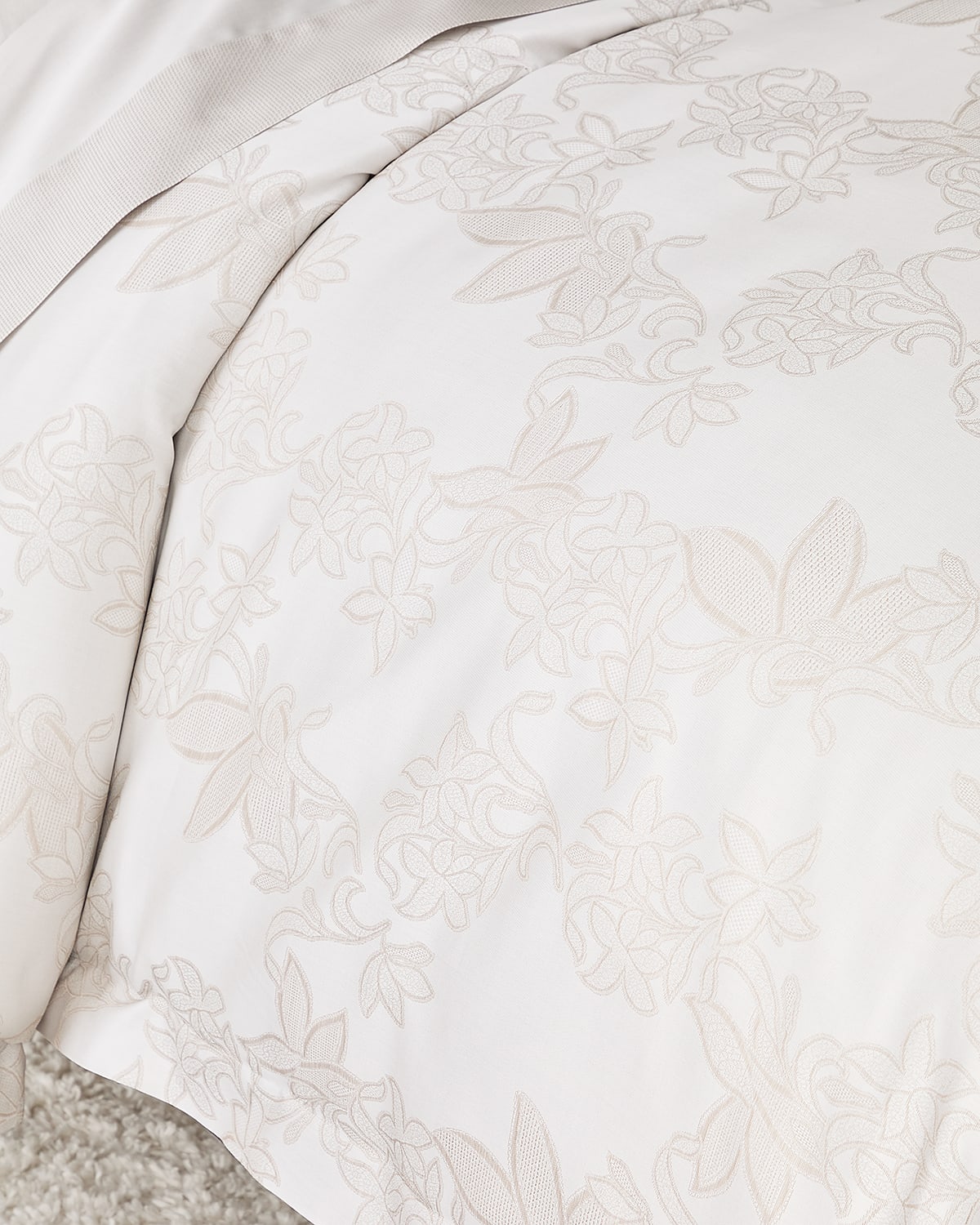 In the storied threads of Tivoli, a tale of romantic nostalgia unfolds. This exquisite Italianmade yarndyed sateen jacquard weaves a delicate floral design, reminiscent of the intricate texture of lace. The soft, taupe base of Tivoli gently cradles these ethereal blooms, as though they harbor secrets from bygone eras. Crafted of longstaple cotton Softly textured handfeel Approx. 106" x 92" Machine wash warm Made in Italy