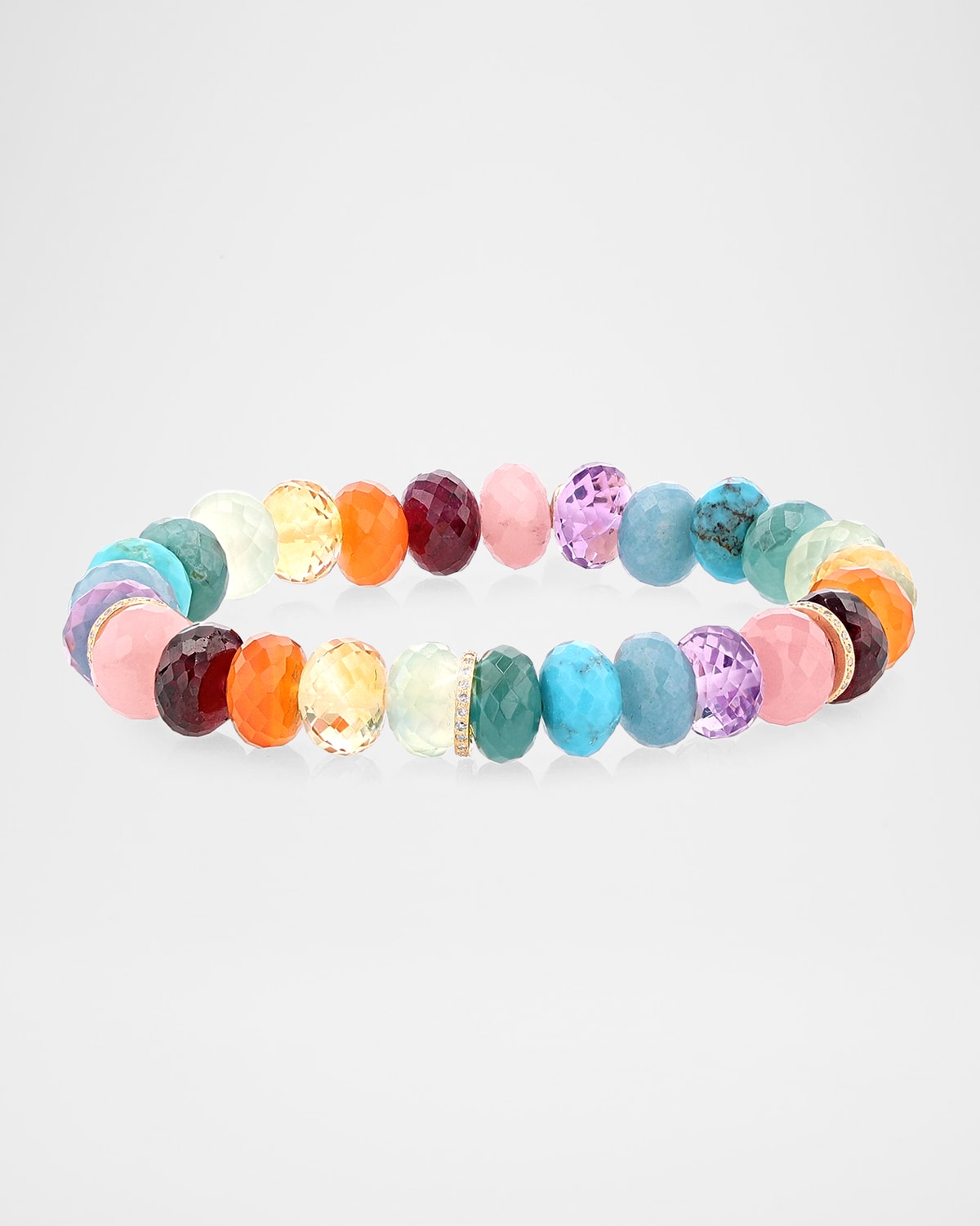 Sheryl Lowe stretch bracelet Three rondelle spacers in 14karat gold Each rondelle is decorated with diamonds 10mm multicolor gemstones including turquoise, amethyst and garnet Diamond total carat weight: 0.75 Slipon style Wipe clean Made in USA