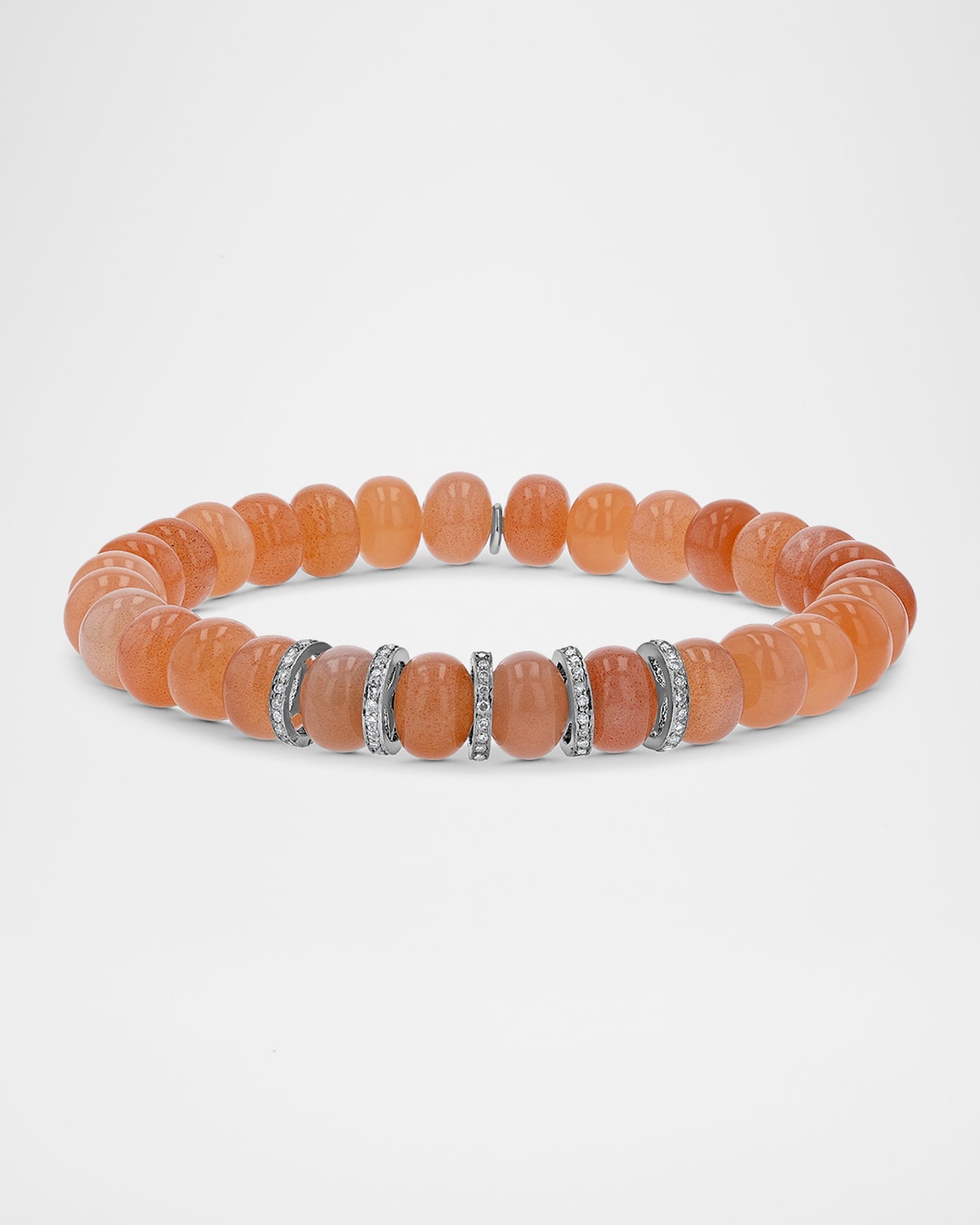 Sheryl Lowe stretch bracelet Sterling silver with pavé diamonds 8mm smooth peach moonstones Diamond total carat weight: 0.45 Stretchy; slipon style Made in USA
