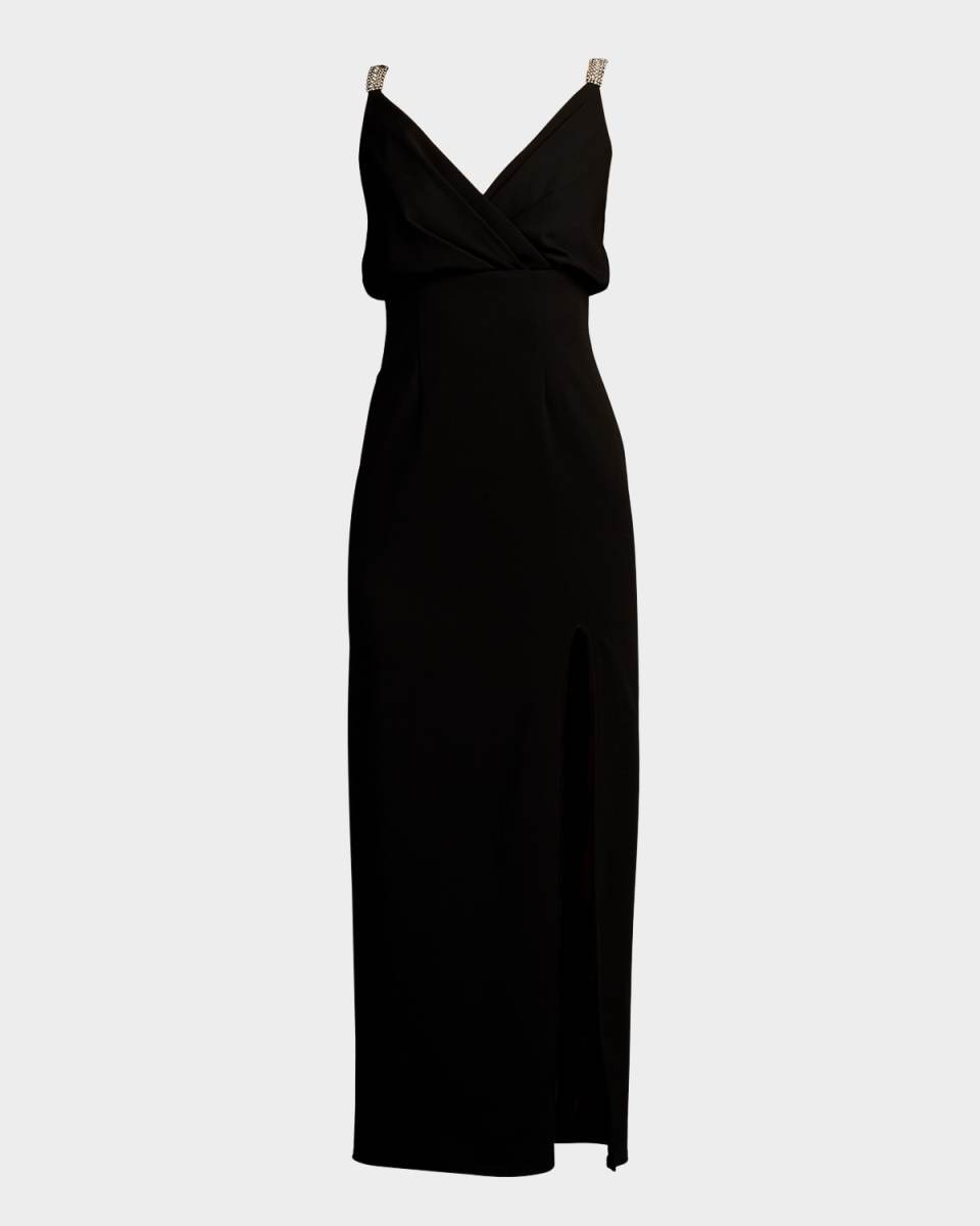 SHO by Tadashi Shoji maxi dress in crepe with beaded shoulder straps Approx. 52"L from shoulders to hem V neckline Sleeveless Pleated blouson bodice Side slit hem Ankle length Column silhouette Invisible back zipper Polyester/spandex Lining: Polyester Dry clean Imported
