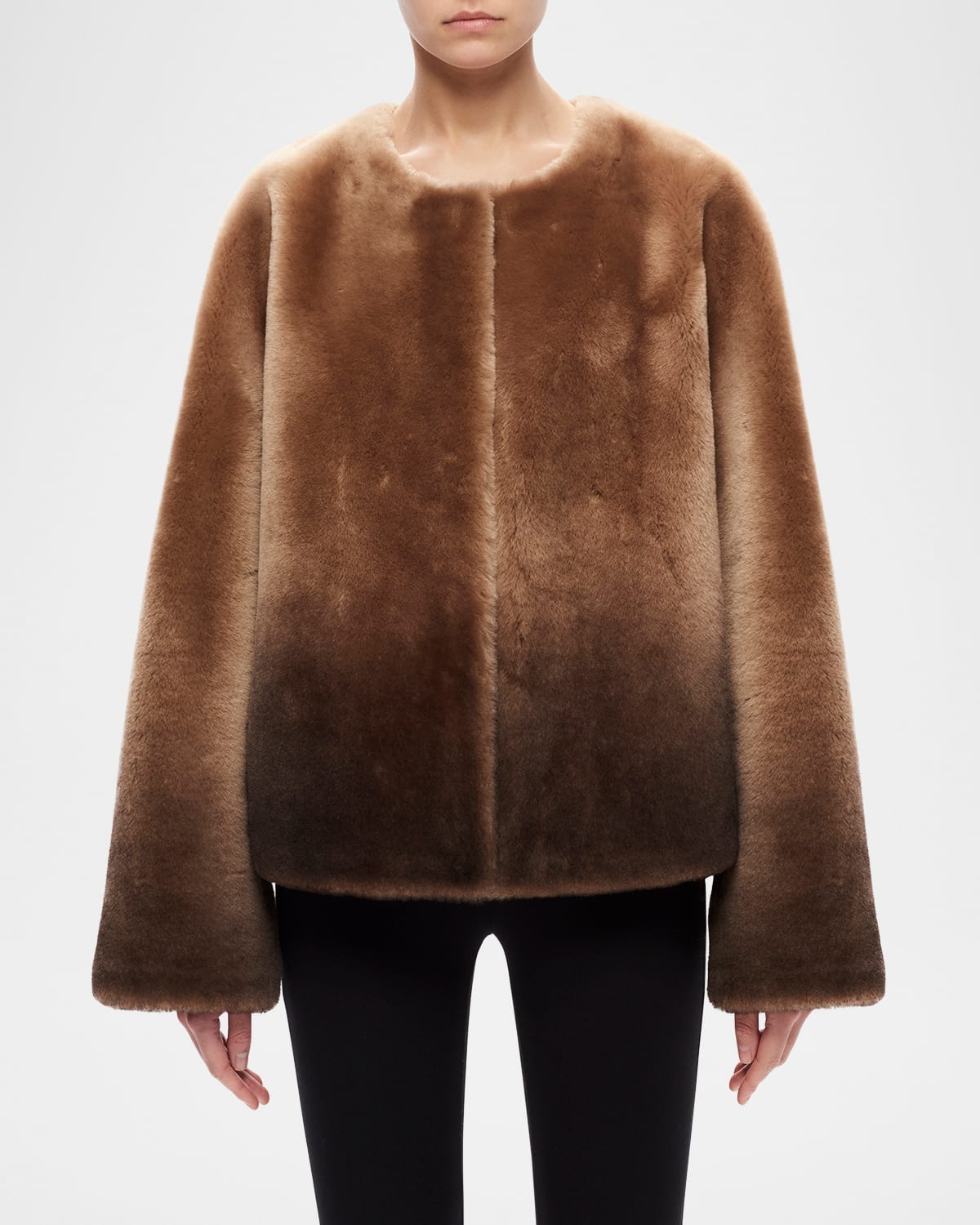Shoreditch Ski Club "Iris" dyed shearling (Turkey) jacket featuring an ombre effect Round neckline Dropped shoulders Long sleeves; approx. 24.4"L Relaxed fit Hem falls to the hip Front hook closure Shearling Professional cleaning is recommended. Do not leave in direct sunlight as color will fade. Color may transfer onto other garments and upholstery. Avoid exposure to rain and moisture as color may transfer. Imported