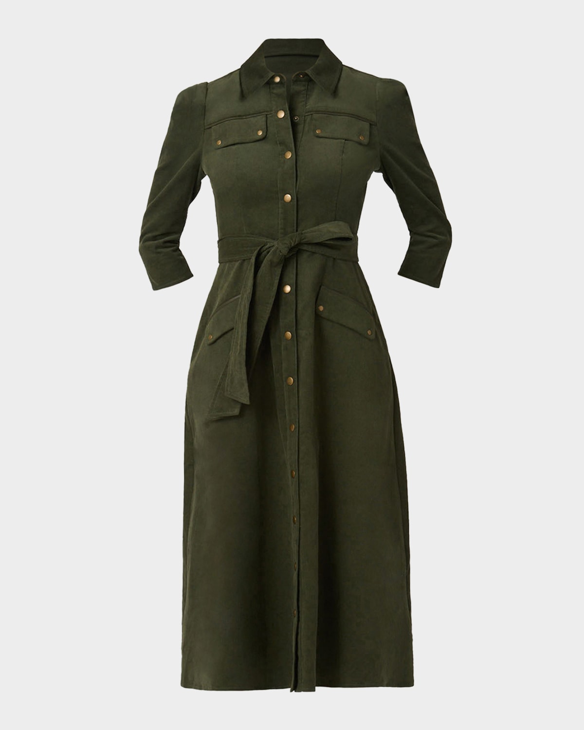 The "Amanda" midi shirtdress from Shoshanna is crafted in refined corduroy with faux leather trim and brass hardware for a polished finish Approx. 49"L from shoulders to hem Spread collar; snap front 3/4 puff sleeves Front and back yokes Chest flap pockets Waist selftie Hip flap pockets Hem falls below the knee Aline silhouette Cotton Unlined Dry clean Imported