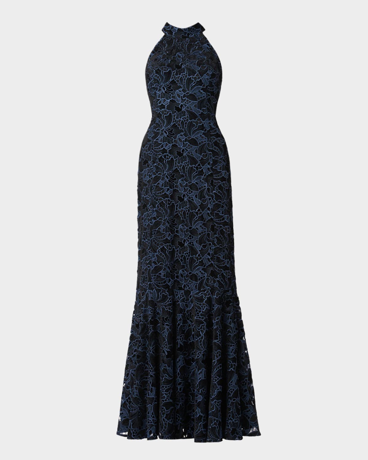Cut from twotone velvet lace, this Shoshanna "Marcia" gown fits the figure with princess seams and drapes softly on the hem Approx. 58.5"L from shoulders to hem Halter neckline Sleeveless Princess seams Full length Trumpet silhouette Invisible back zipper Polyester Lining: Polyester Dry clean Made in USA from imported materials