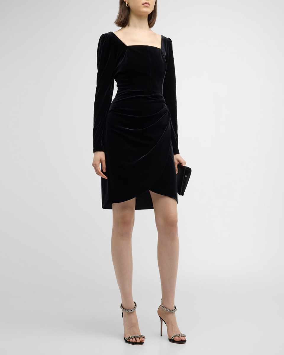 Shoshanna "Soho" velvet mini dress with draped skirt Square neckline Long sleeves Tulip skirt Hem falls above the knee Aline silhouette Invisible back zipper Polyester/spandex Lining: Polyester Dry clean Imported