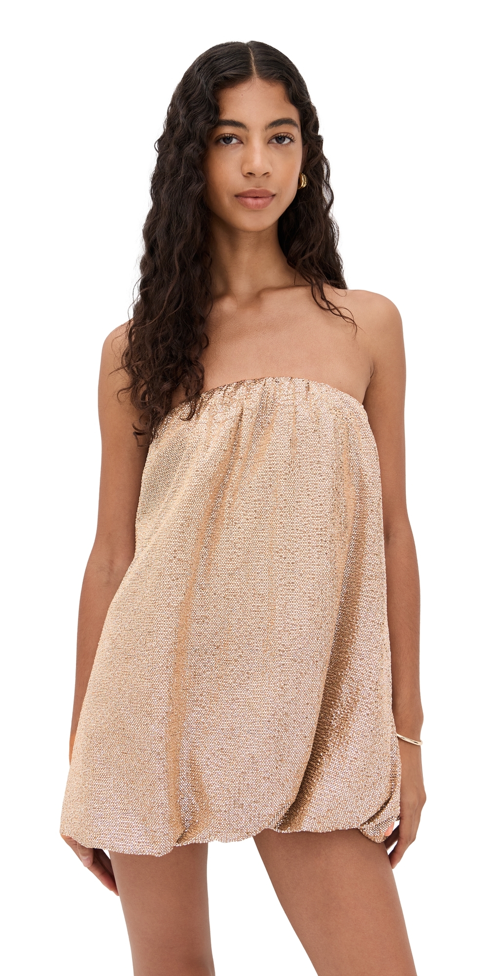 Fabric: Lightweight, low-stretch jersey. Allover silver-tone polka dots. Bubble hem. Elastic band and non slip rubber binding at neckline. Mini length. Strapless. Sleeveless. Pullover design, no closure. On-seam side pockets. Shell: 100% polyester. Lined. Hand wash. Made in the USA. Measurements: Measurements from size XS Length: 20.5in / 52.0cm, from center back