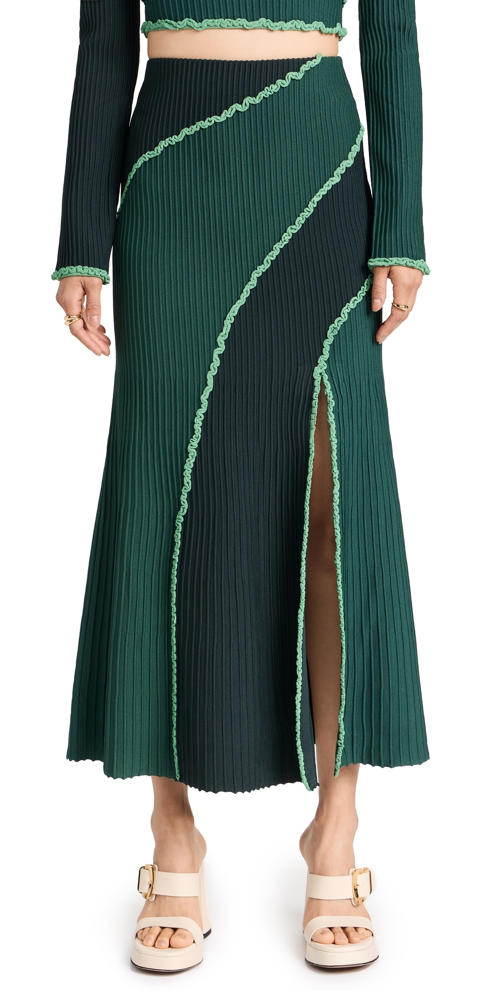 Fabric: Mid-weight ribbed knit. Two-tone panels and ruffle trim. Thigh-high side slit. Covered elastic waistband. Shell: 50% nylon/50% viscose. Hand wash. Imported, China. Measurements: Measurements from size 2 Length: 34.25in / 87.0cm
