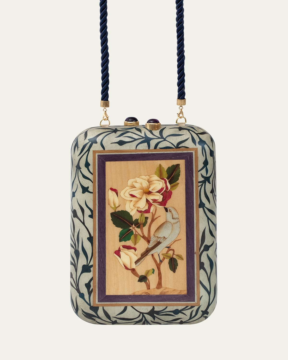 Silvia Furmanovich rectangle clutch Approx. 8.27"L x 5.3"W Multicolor wood Polished 18karat yellow gold hardware Removable shoulder strap Push closure with gemstone bezels Made in Brazil