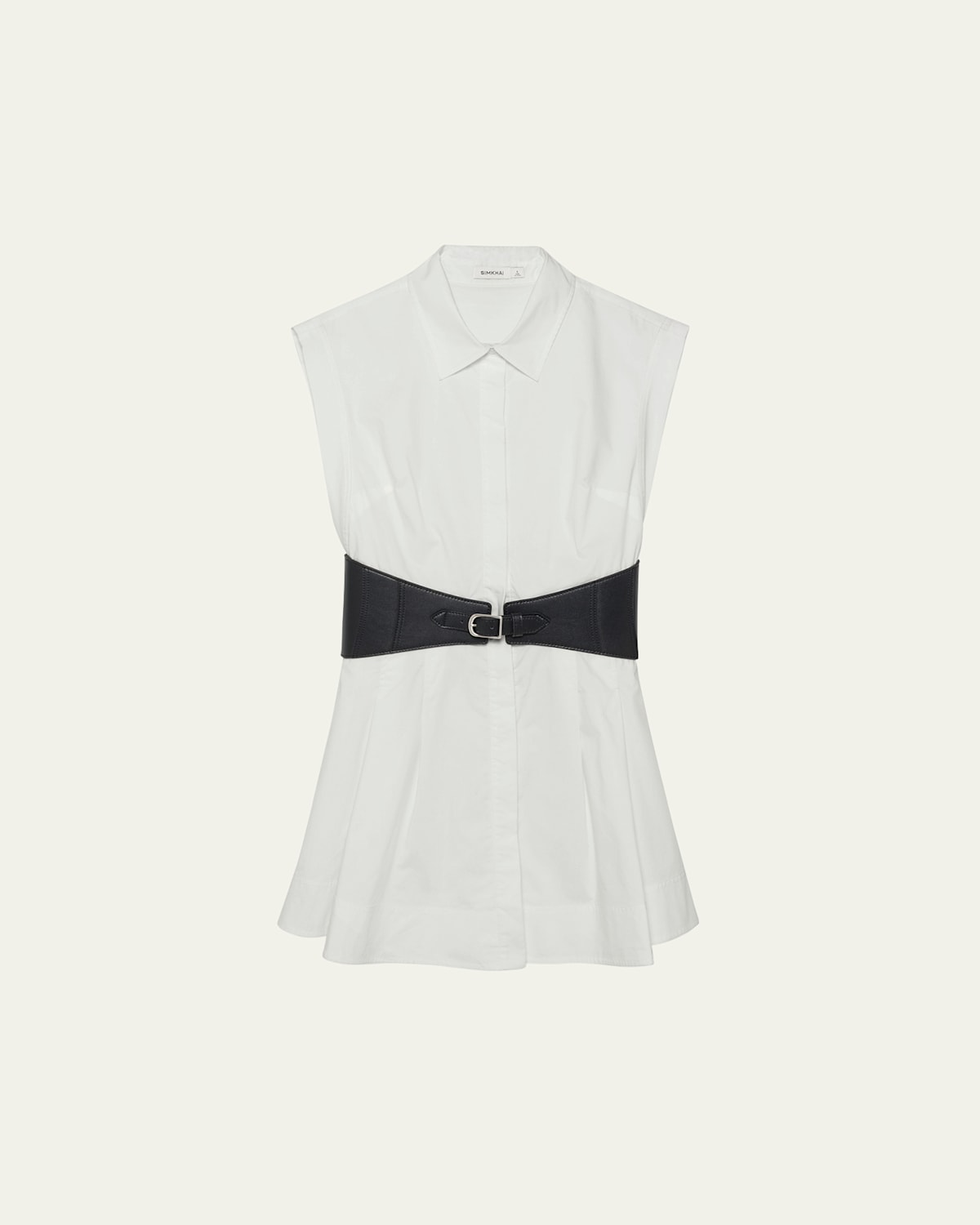 SIMKHAI "Adler" cottonblend mini dress elevated with a wide belted waist Point collar Sleeveless Shirtdress silhouette Hem falls above the knee Concealed buttonfront Cotton/polyester Dry clean Imported