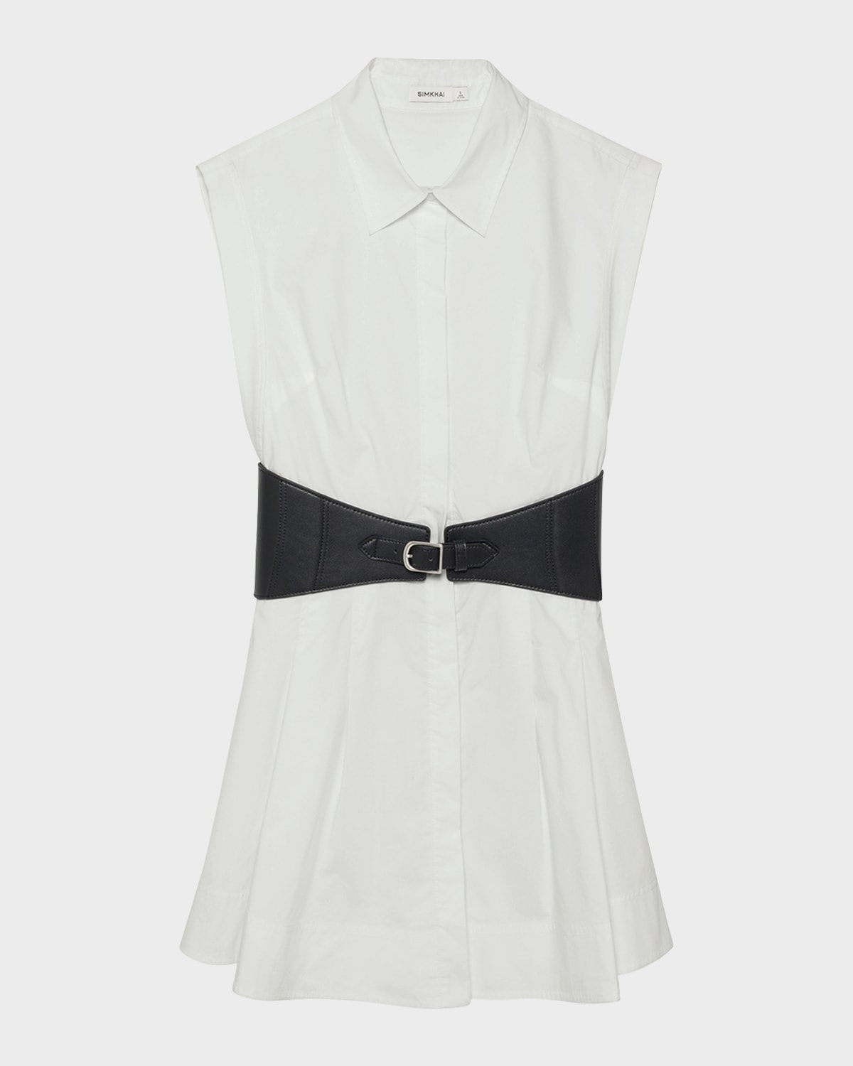 SIMKHAI "Adler" cottonblend mini dress elevated with a wide belted waist Point collar Sleeveless Shirtdress silhouette Hem falls above the knee Concealed buttonfront Cotton/polyester Dry clean Imported