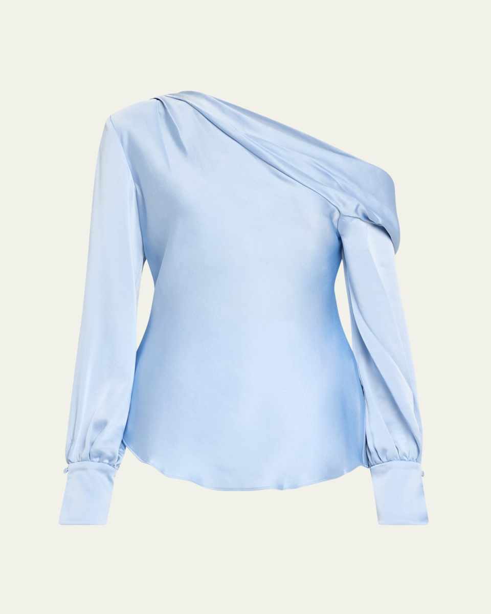 SIMKHAI "Alice" satin top featuring an asymmetric drape Oneshoulder neckline Long sleeves with button cuffs Curved hem Slim fit Acetate/polyester Dry clean Imported
