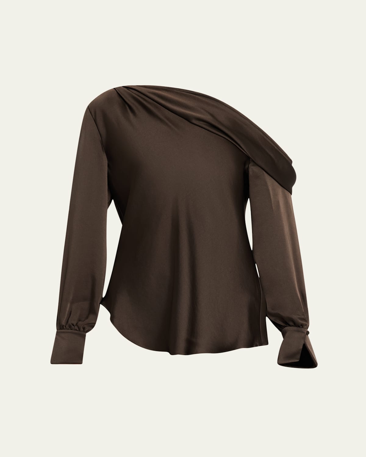 SIMKHAI "Alice" satin top featuring a oneshoulder neckline Long sleeves with button cuffs Loose fit Rounded hem Pullover style Acetate/polyester Dry clean Imported