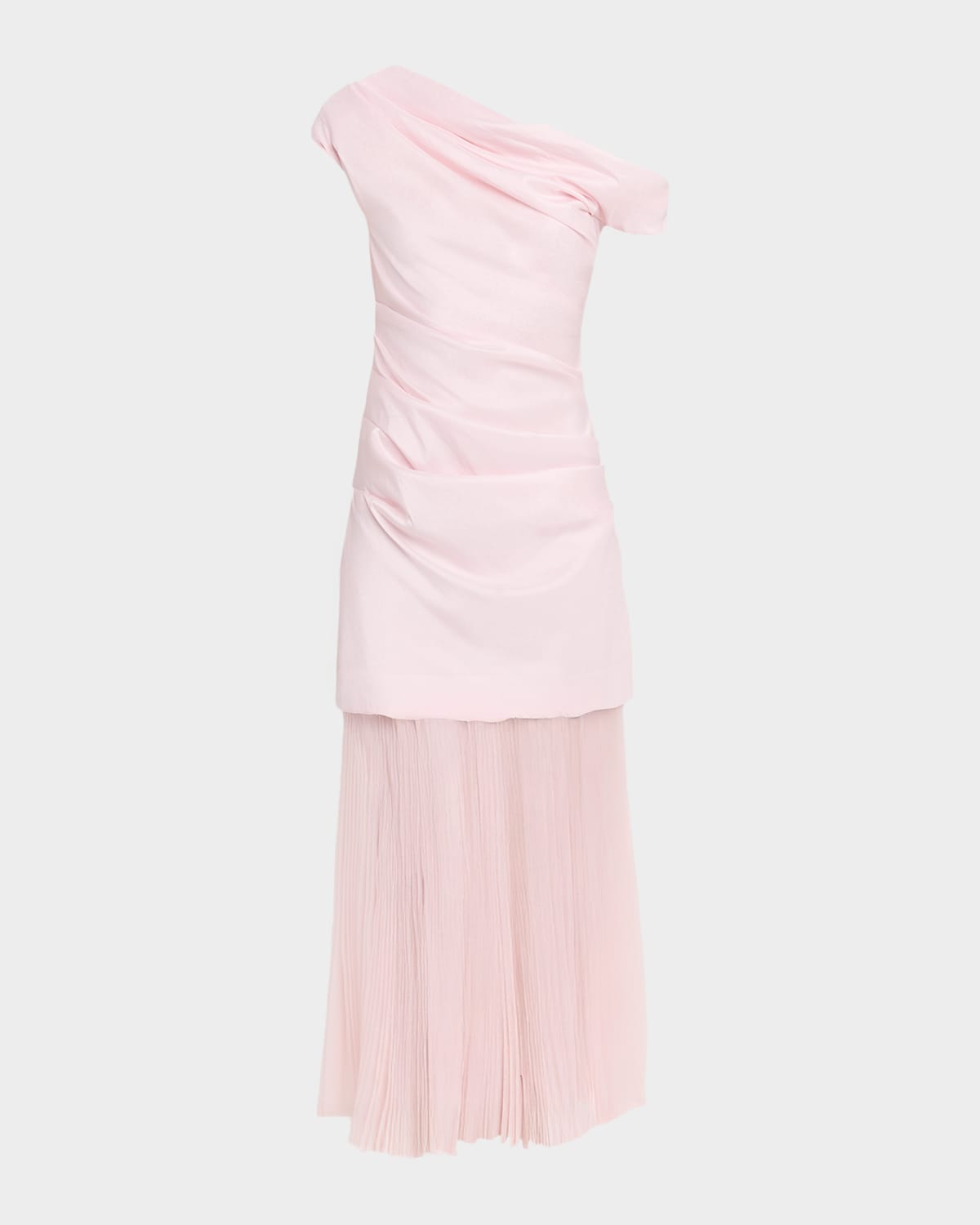 A wondrous vision defined by precise tailoring, the SIMKHAI "Ammalie" dress combines a ruched bodice with a sheer accordionpleated skirt Approx. 56.5" from shoulder to hem Oneshoulder neckline Short cap sleeves Tea length Aline silhouette Concealed zip closure Polyester/nylon/polyamide Lining: Polyester Dry clean Imported