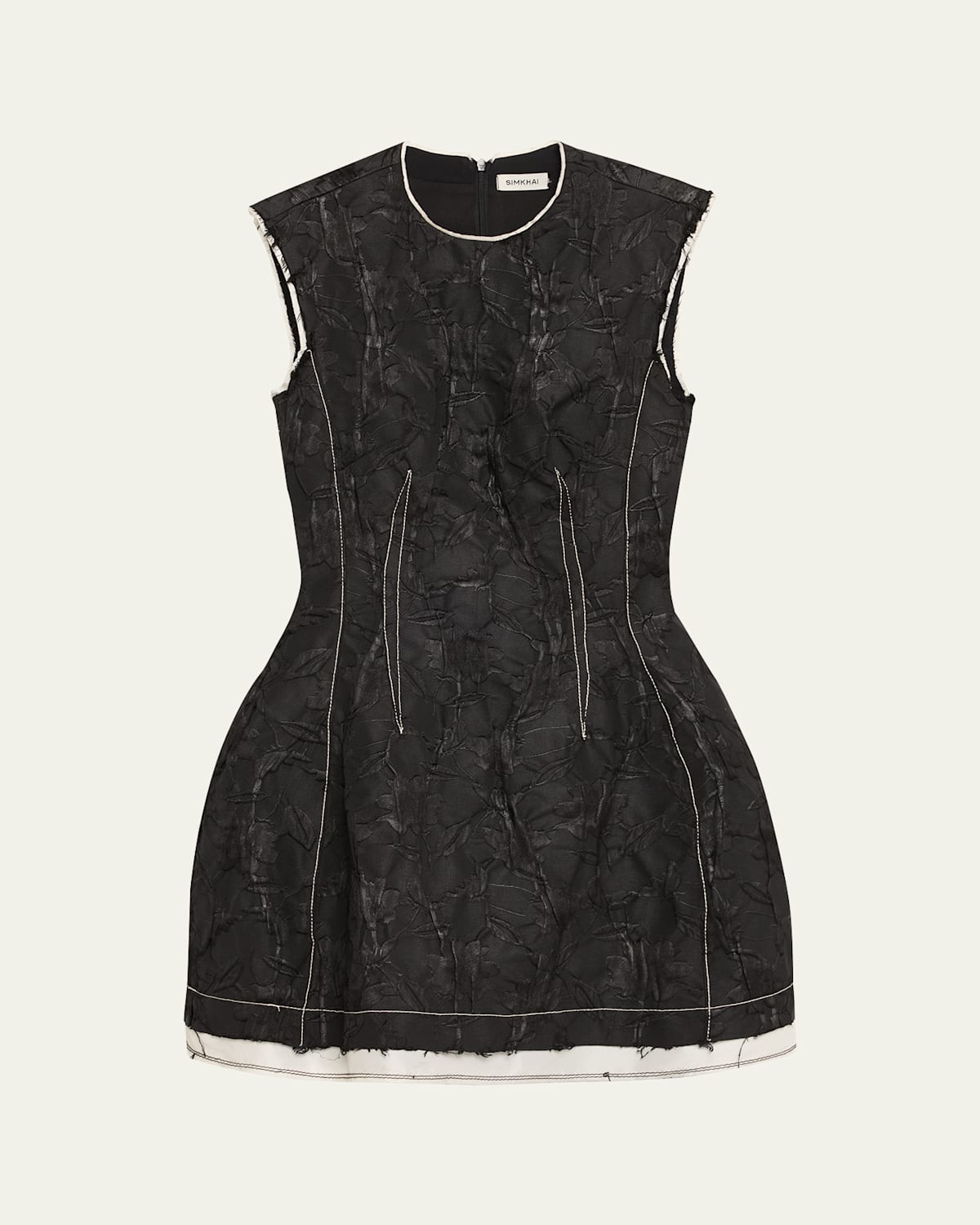 Crafted in waxed floral jacquard, the "Audrina" mini dress by SIMKHAI features a structured silhouette and exposed, contrast stitching. Crew neckline Sleeveless Aline silhouette Hem falls above the knee Center back zip Polyester/cotton/nylon/polyamide Imported