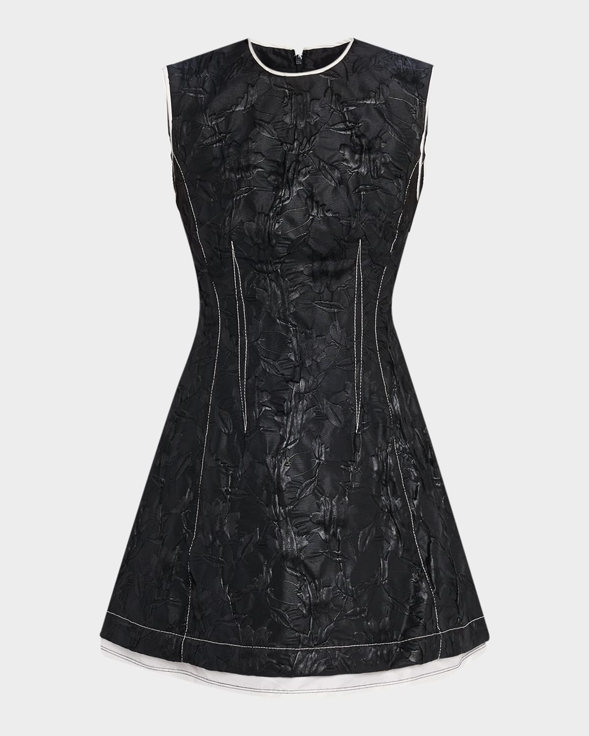 Crafted in waxed floral jacquard, the "Audrina" mini dress by SIMKHAI features a structured silhouette and exposed, contrast stitching. Crew neckline Sleeveless Aline silhouette Hem falls above the knee Center back zip Polyester/cotton/nylon/polyamide Imported
