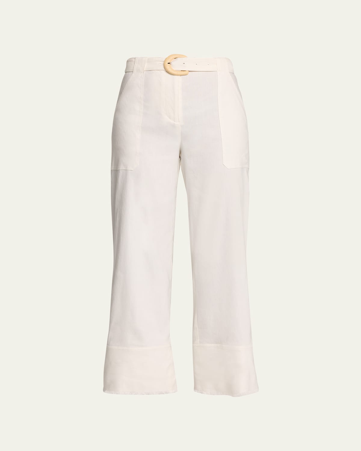 SIMKHAI pants crafted from lightweight and breathable fabric Approx. measurements: 11.3" rise; 27" inseam Side slash pockets; back patch pockets Mid rise; flat front Removable buckle belt Fitted through hip; flared from knee Cropped at the ankle Linen/rayon/spandex Dry clean Imported