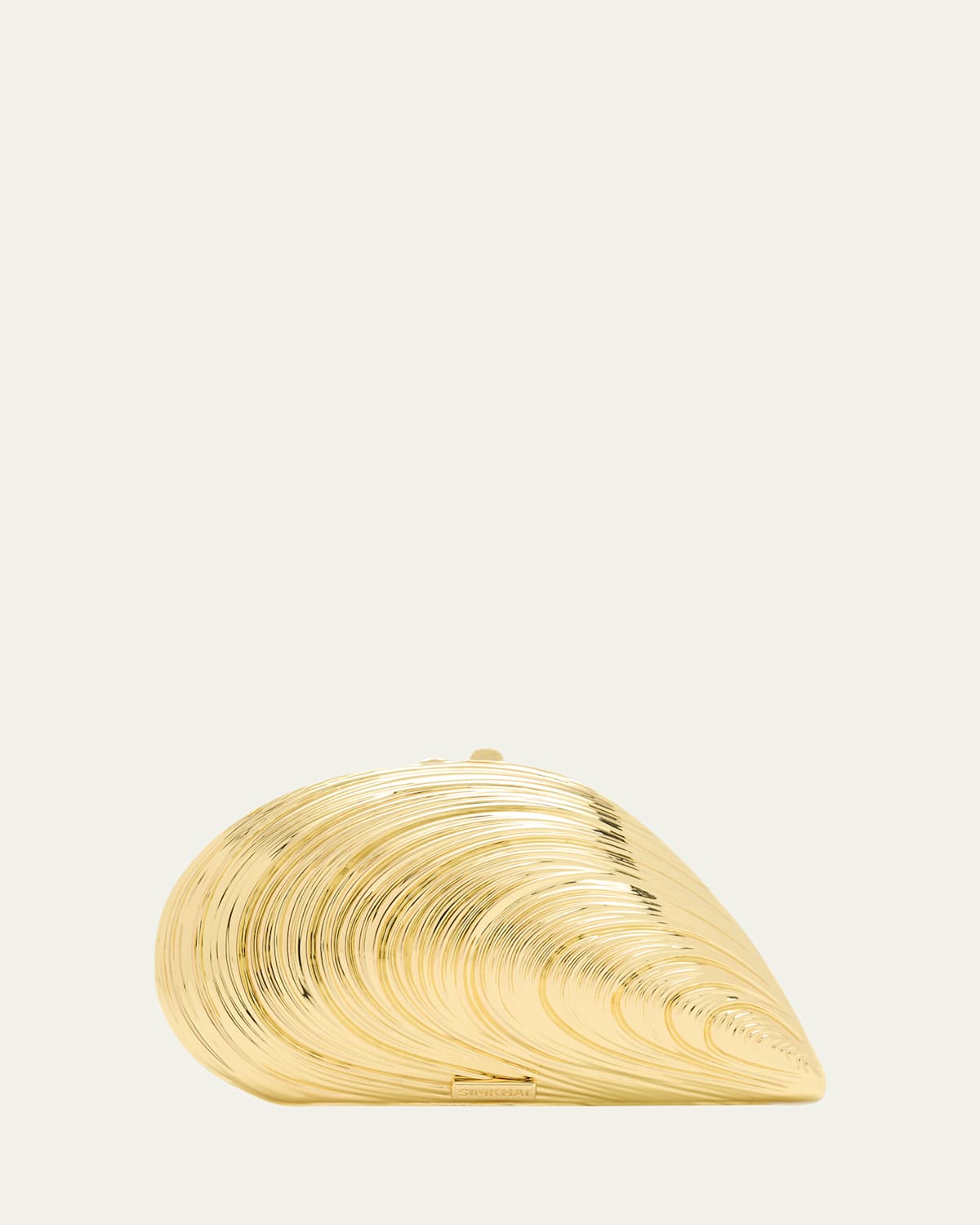 SIMKHAI "Bridget" oyster shell clutch bag in aluminum, complete with intricate texture and a lustrous finish Detachable chain shoulder strap, 20"L Can be worn as a clutch or shoulder bag Structured top with magnetic closure Approx. 5"H x 7"W x 5.5"D Imported