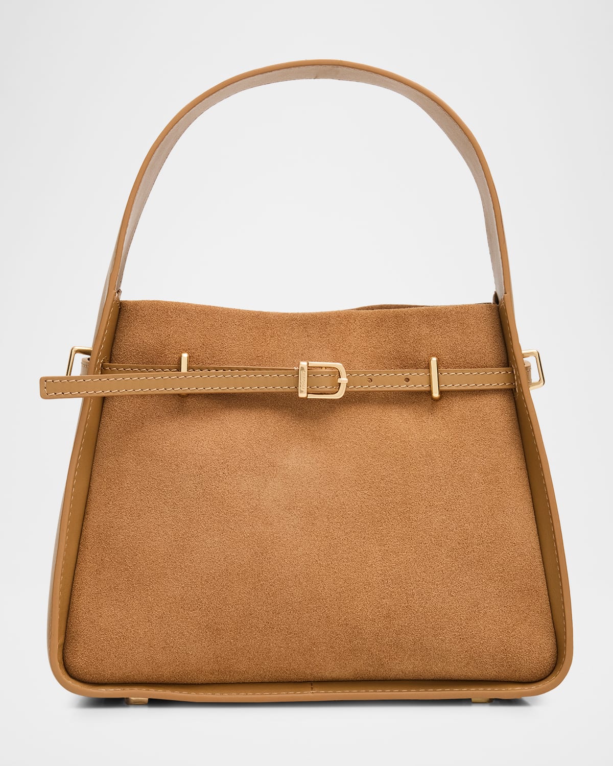 This structured "Cleo" tophandle bag from SIMKHAI combines smooth leather with soft suede, featuring a topstitched belt detailed with goldtone hardware Flat top handle Open top with magnetic strap closure Interior, one slip pocket Feet protect the bottom of the bag Lining: Polyester Trim: Leather Approx. 7"H x 9.3"W x 4.7"D Imported