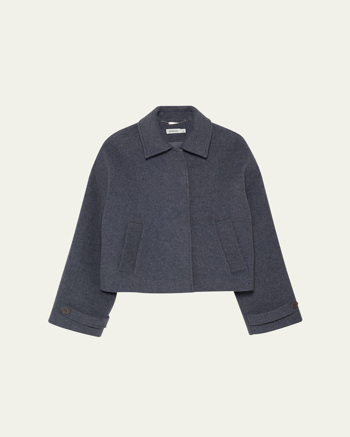 SIMKHAI "Colby" minimalist woolblend jacket Point collar Dropped shoulders Long sleeves with belted cuffs Side pockets Relaxed, boxy fit Hem sits at the hip Concealed buttonfront Wool/polyester/viscose Dry clean Imported