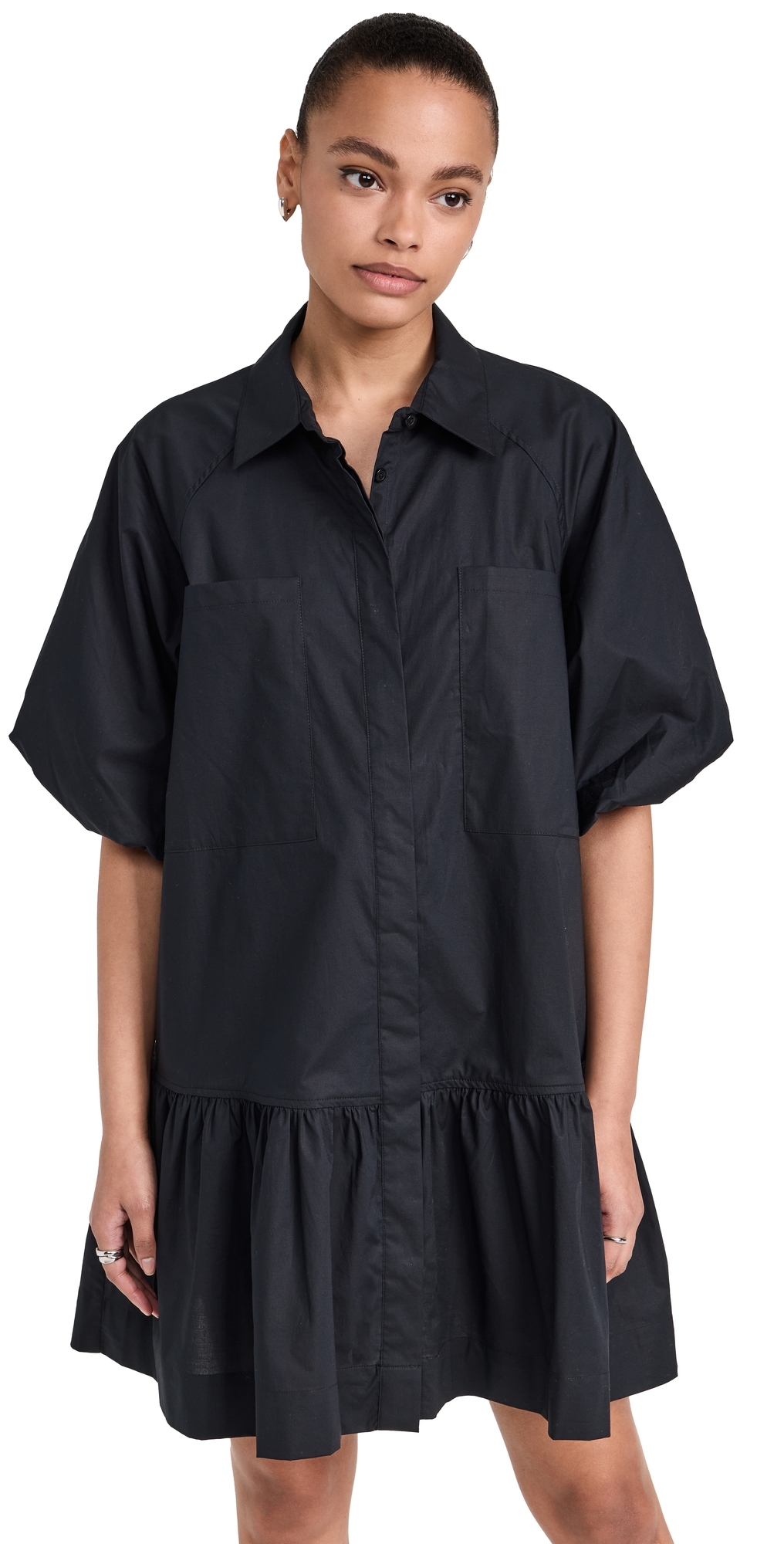 Fabric: Lightweight, stretch poplin. Oversized patch breast pockets. Drop waist and ruffle skirt. Collared neck. Short puff sleeves with elastic cuffs. Covered button placket. On-seam hip pockets. Shell: 97% cotton/3% spandex. Unlined. Dry clean. Imported, China. Measurements: Measurements from size M Length: 35in / 89.0cm, from shoulder