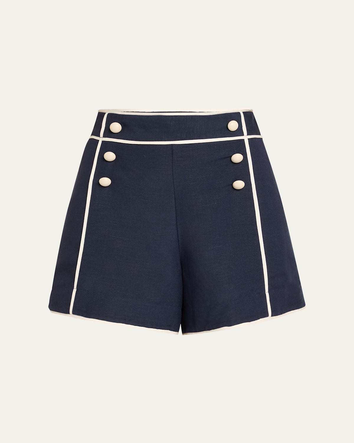 SIMKHAI "Crosby" shorts with sailorinspired buttons and contrasting trims High rise Back welt pockets Relaxed legs Hidden side zipper Linen/viscose Imported