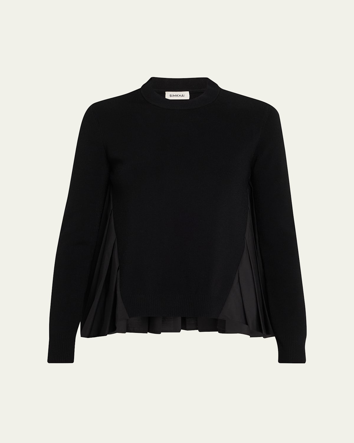 SIMKHAI "Elanore" sweater elevated with pleated satin paneling Crew neckline Long sleeves Classic fit Hem falls to the hip Pullover style Polyester/viscose Dry clean Imported