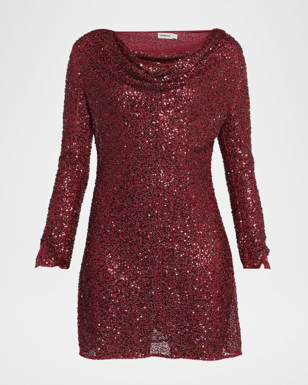 The "Emmy" mini dress from SIMKHAI dazzles with sparkling sequins and beading on shimmering mesh Approx. 31.5"L from shoulders to hem Cowl neckline Long sleeves Split cuffs Hem falls above the knee Aline silhouette Nylon/polyamide/polyester Dry clean Imported