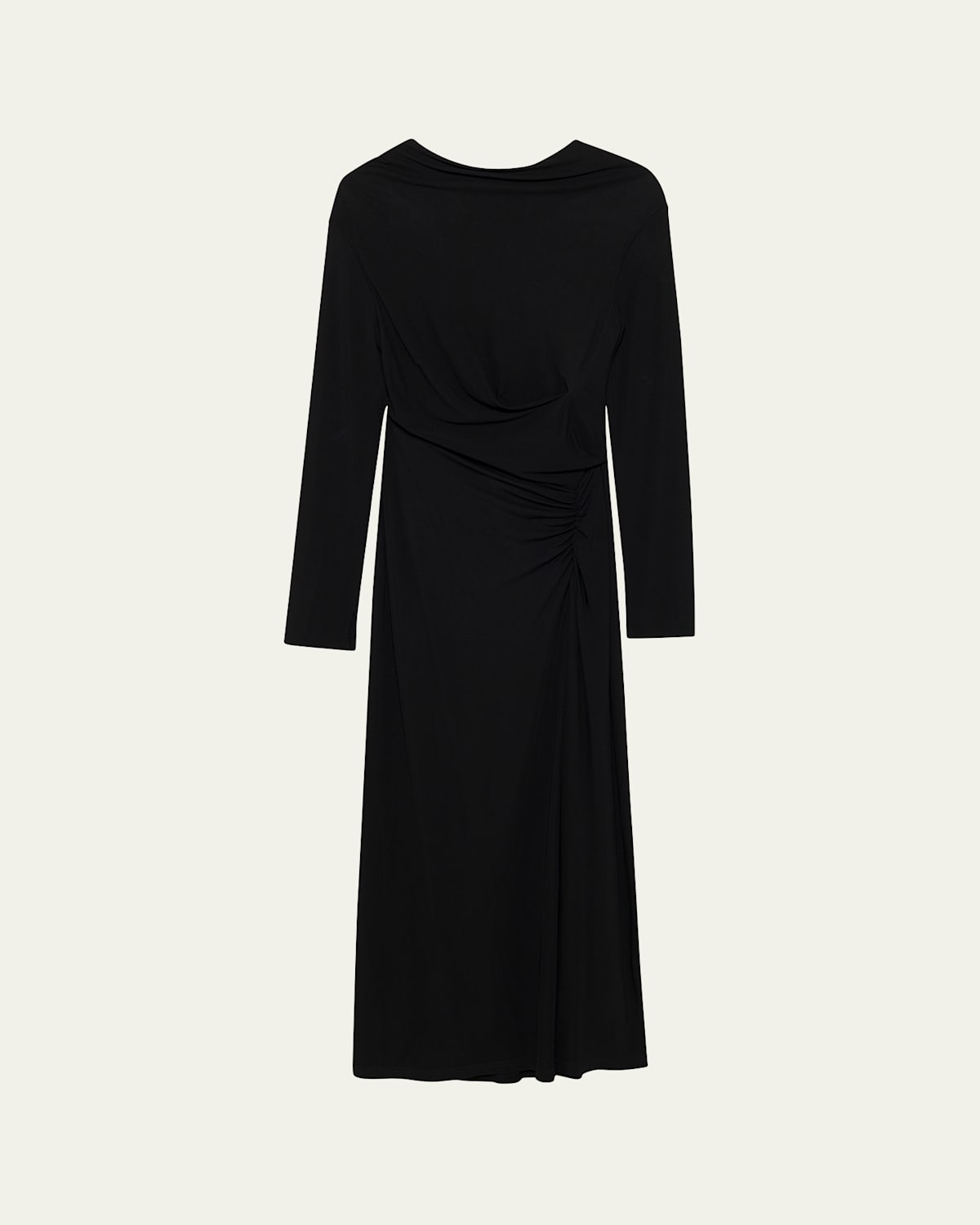 SIMKHAI "Ferrera" stretch midi dress with ruching Draped high neckline Long sleeves Aline silhouette Hem falls below the knee Slipover style Rayon/cellulose acetate/spandex Dry clean Imported