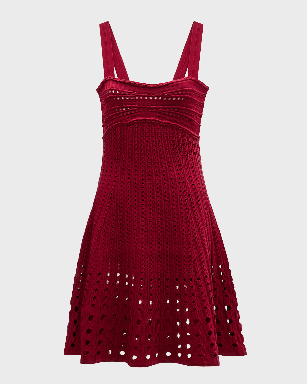 SIMKHAI "Franklin" crochet mini dress featuring a circular pattern Approx. 35"L from shoulder to hem Square neckline Wide straps Empire waist Hem hits above the knee Aline silhouette Slipover style Rayon/cellulose acetate/polyester Unlined Dry clean Imported