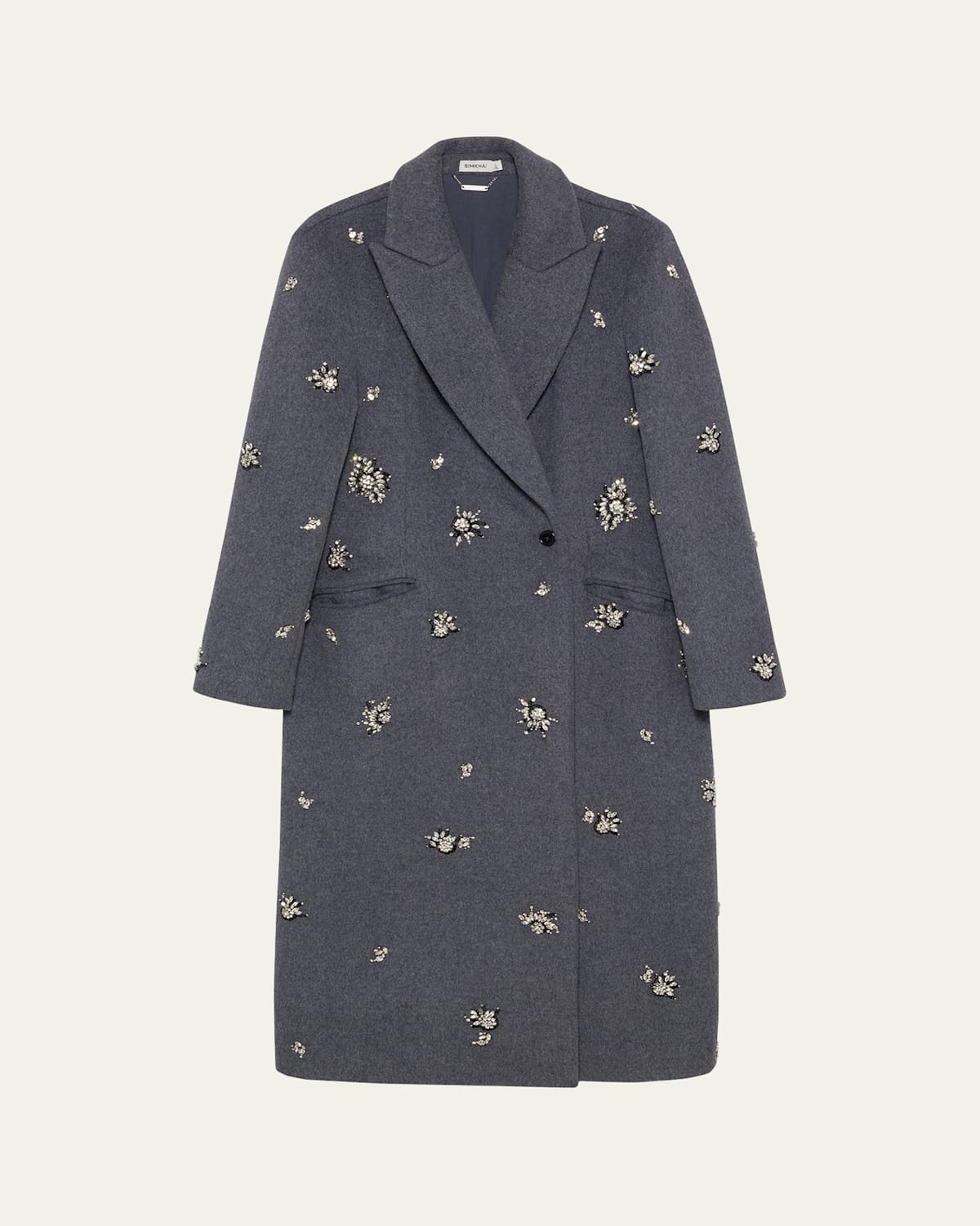 SIMKHAI "Gianni" woolblend coat elevated with crystalembellishment throughout Peak lapels Doublebreasted front Long sleeves with button cuffs Hip pockets Relaxed, oversized fit Walking vent Buttonfront Wool/polyester/viscose Dry clean Imported