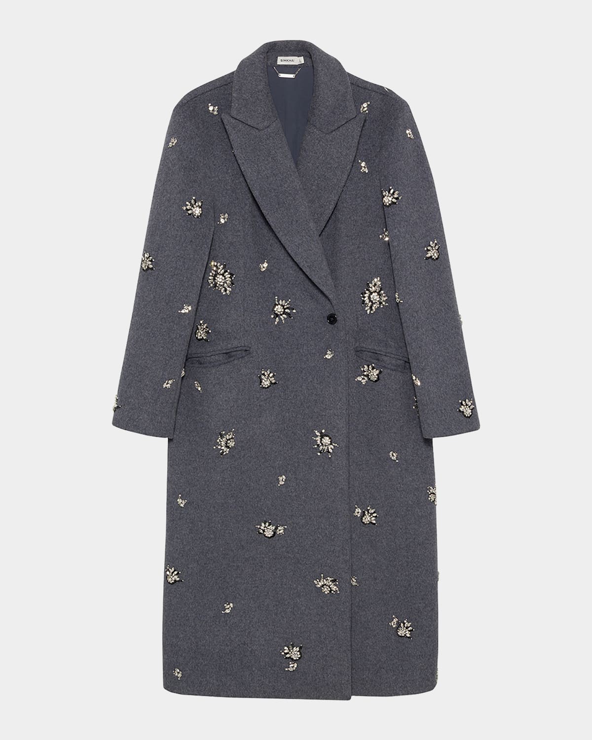 SIMKHAI "Gianni" woolblend coat elevated with crystalembellishment throughout Peak lapels Doublebreasted front Long sleeves with button cuffs Hip pockets Relaxed, oversized fit Walking vent Buttonfront Wool/polyester/viscose Dry clean Imported