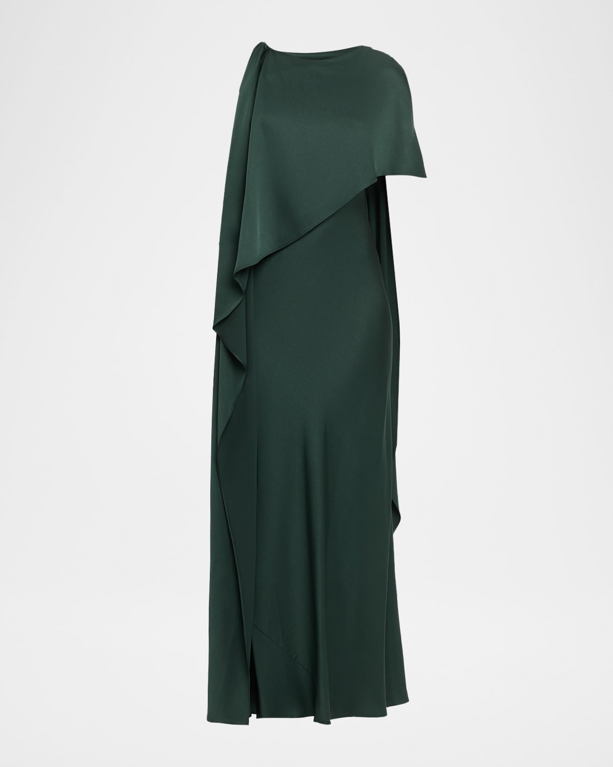 Exude sophistication in the statuesque "Izel" gown from SIMKHAI, elegantly draped with a cascading cape from the shoulder to the hem High neckline Short asymmetric sleeves Full length Column silhouette Keyhole button back Side zipper Rayon/cellulose acetate/polyester Dry clean Imported