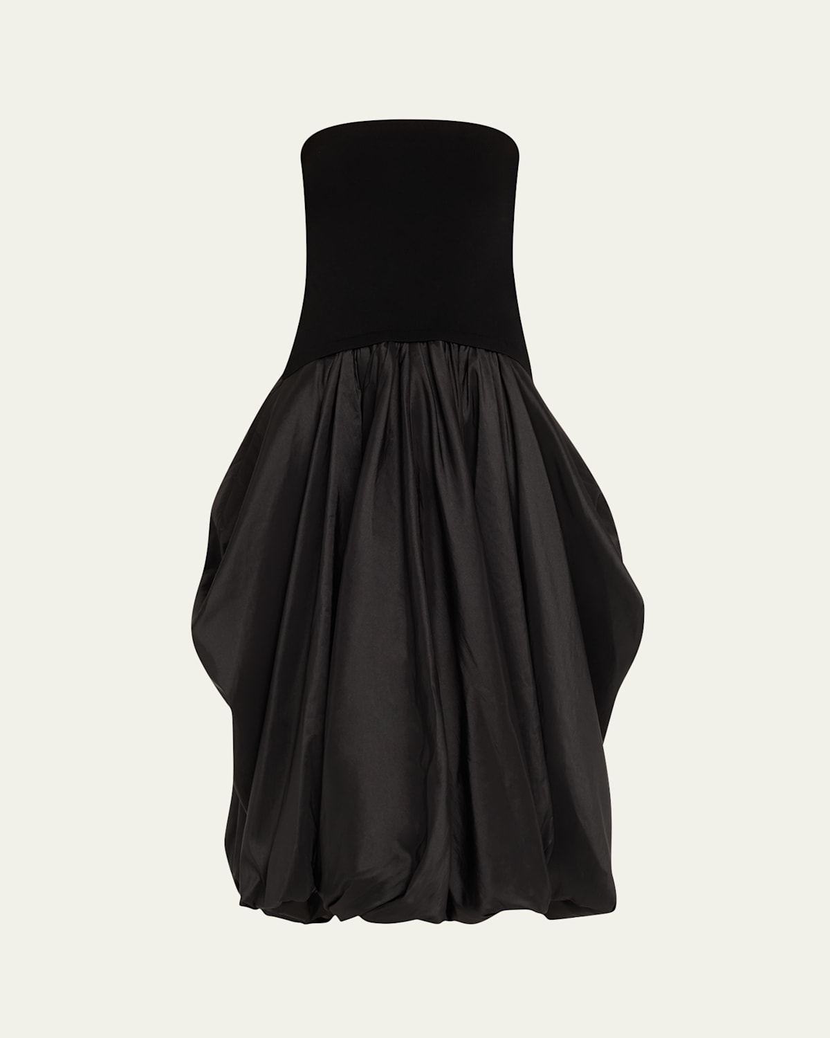 SIMKHAI "Izzy" midi combo dress finished with a draped bubble hem Strapless neckline Sleeveless Side seam pockets Dropwaist silhouette Hem falls below the knee Slipover style Viscose/elastane/polyester Imported