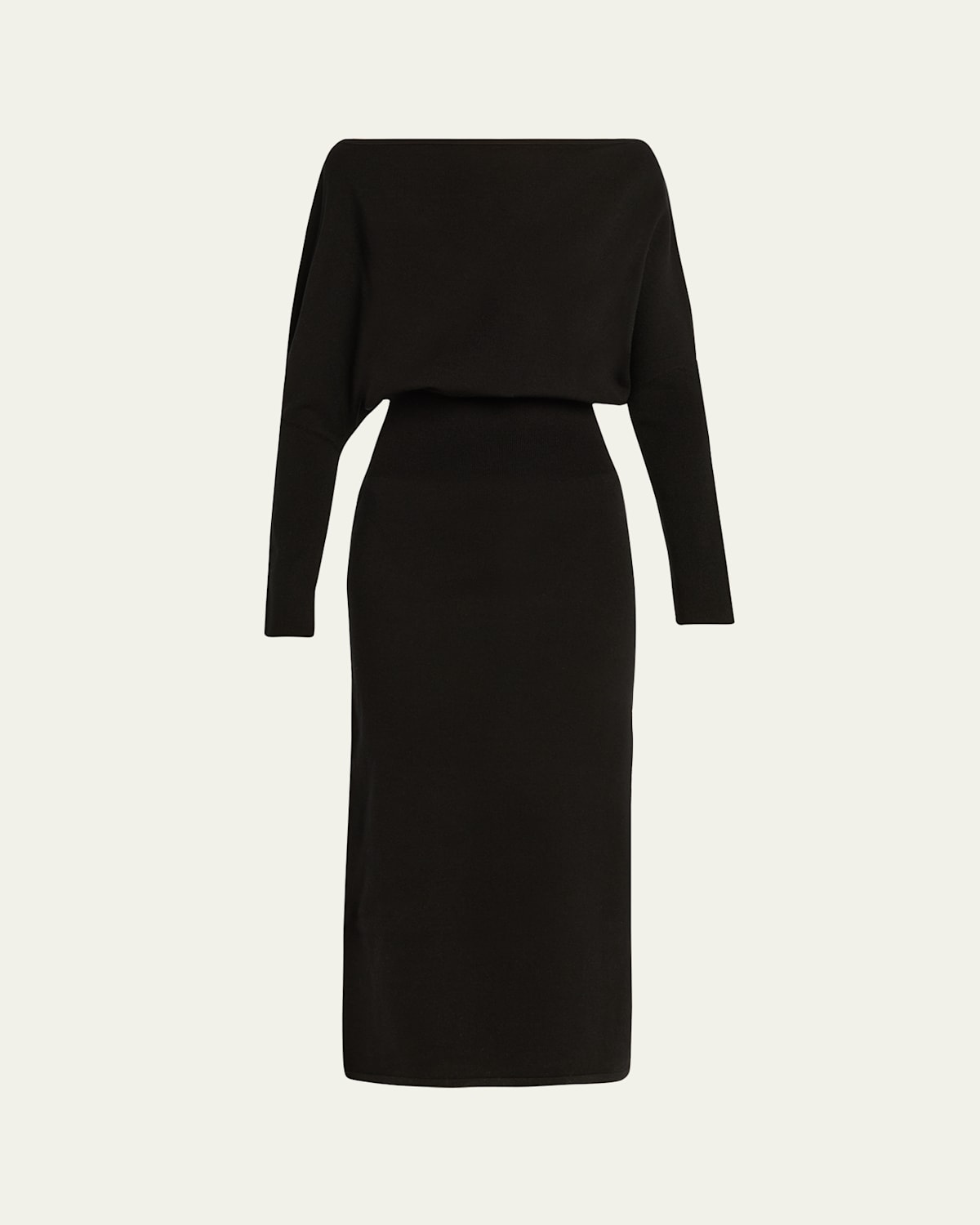 Knitted from featherweight wool, the "Janese" sweater dress by SIMKHAI features a voluminous bodice that extends into a slim, pencilstyle skirt Oneshoulder neckline Fitted long sleeves Banded waist Thighhigh side slit Hem falls below the knee Slipover style Wool Imported