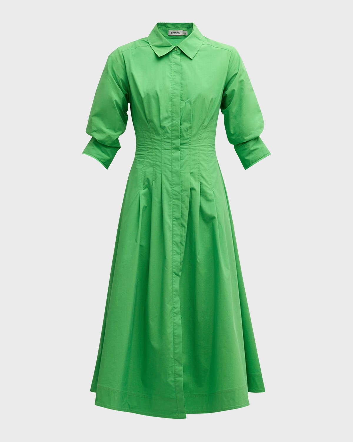 SIMKHAI "Jazz" dress consists of pintuck detailing and a defined waist Spread collar; concealed button placket Threequarter sleeves with button cuffs Side seam pockets Midcalf length Aline silhouette Cotton/polyester Lining: Nylon/rayon Dry clean only Imported