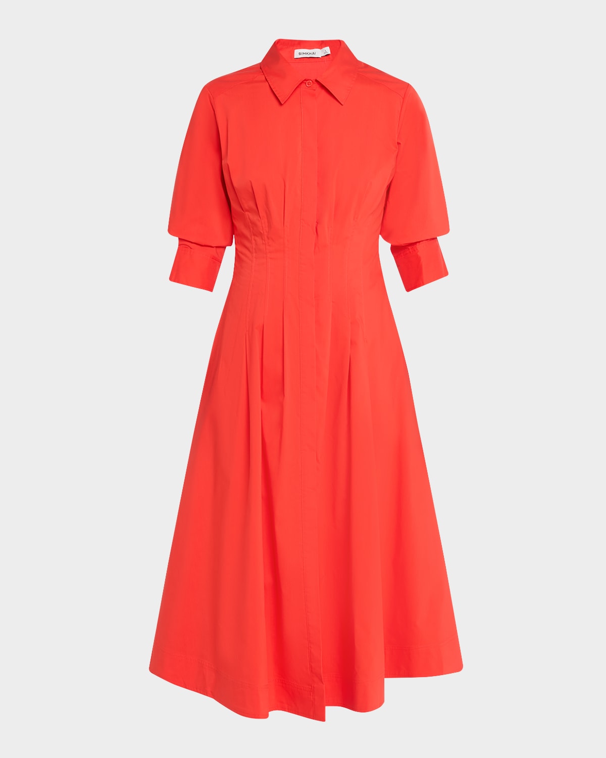 SIMKHAI "Jazz" cottonblend midi dress with pintuck detailing at the waist Point collar Threequarter sleeves with button cuffs Side pockets Aline silhouette Hem falls below the knee Concealed buttonfront Cotton/polyester Dry clean Imported
