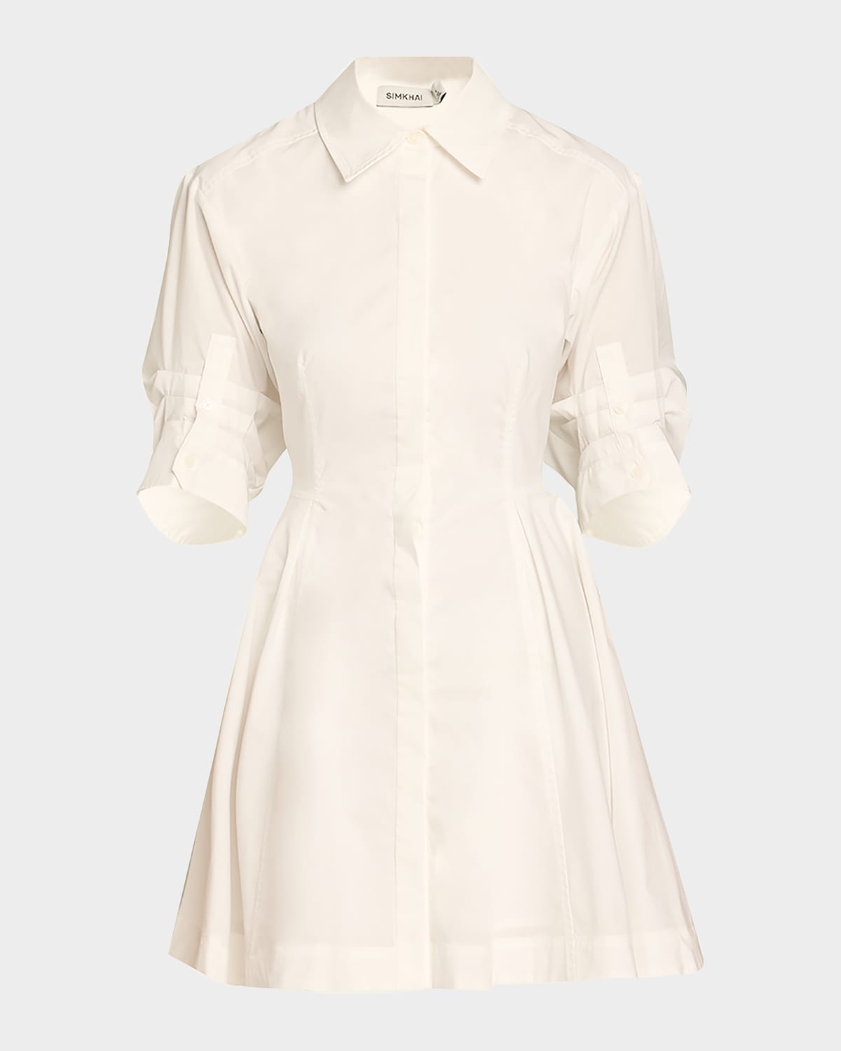 SIMKHAI "Jazzie" mini dress featuring a pintuck waist Point collar Short sleeves with button cuffs Shirtdress silhouette Hem falls above the knee Concealed buttonfront Cotton/polyester Dry clean Imported