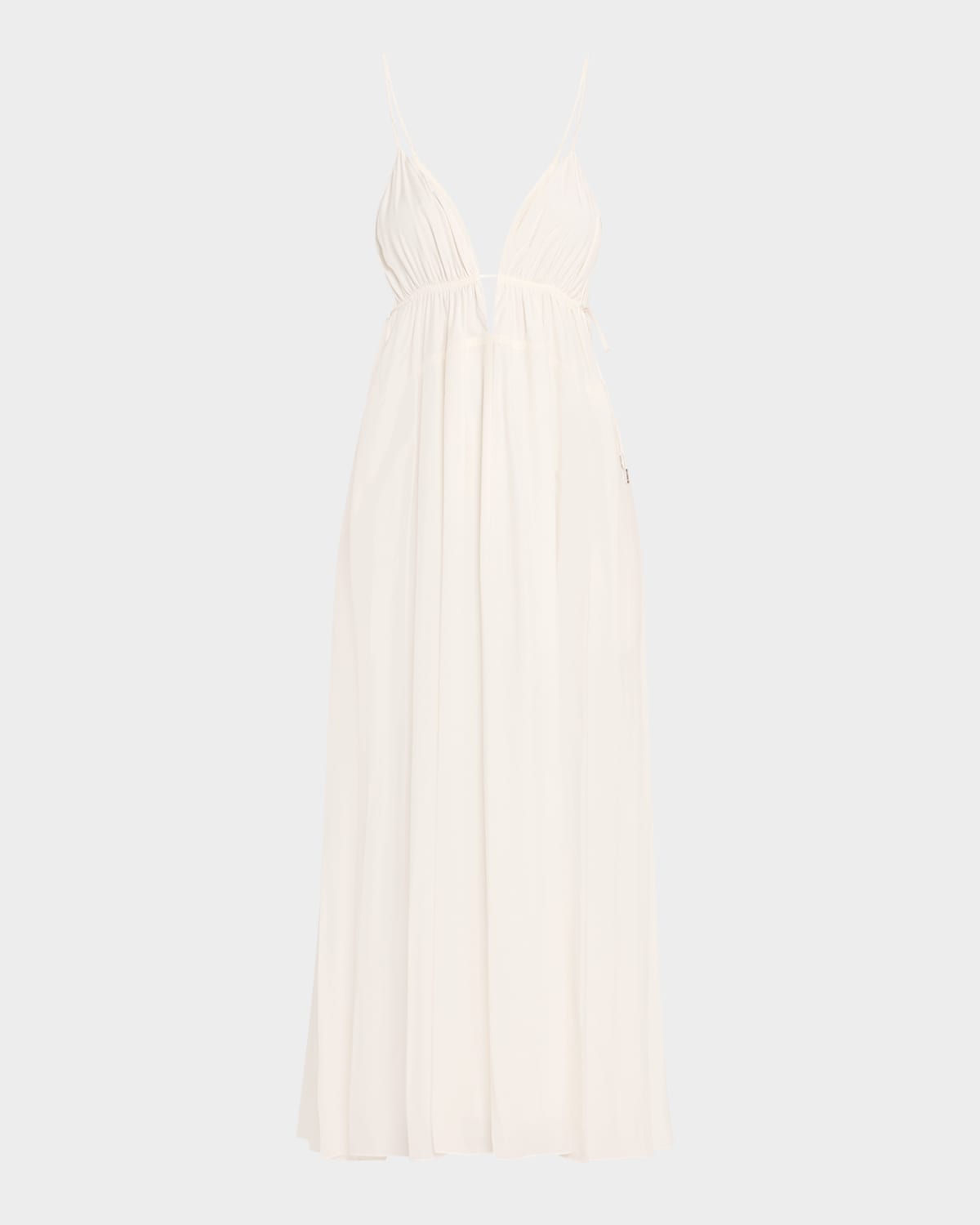 SIMKHAI "Josephine" crepe dress features front and back keyhole cutouts V neckline Sleeveless Lowcut armholes Adjustable selftie sides Side seam pockets Full length Slipover style Viscose/silk Imported