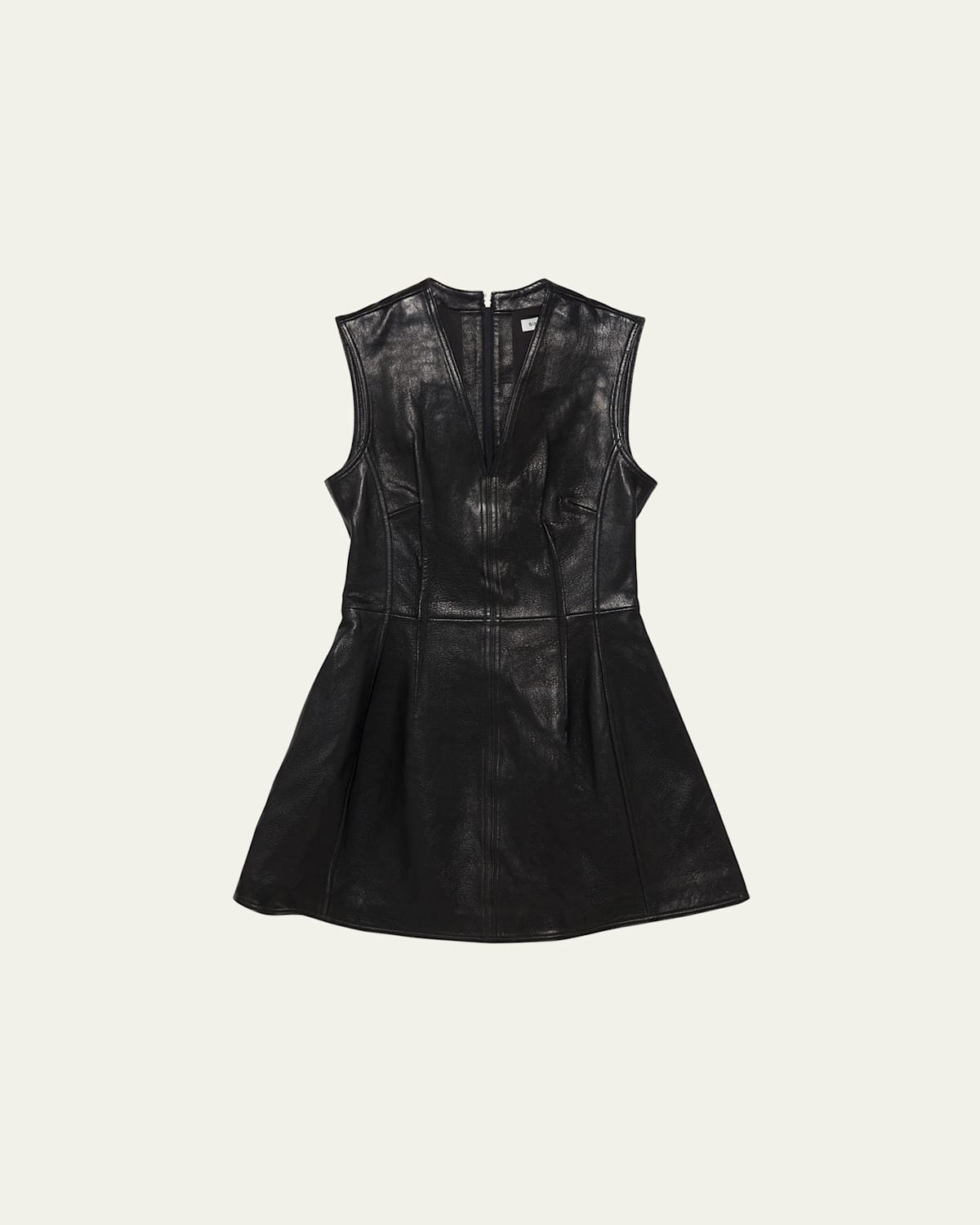 SIMKHAI "Juliette" sculpted leather mini dress V neckline Sleeveless Aline silhouette Hem falls above the knee Invisible side zip Leather/viscose/cotton Professional cleaning recommended Imported