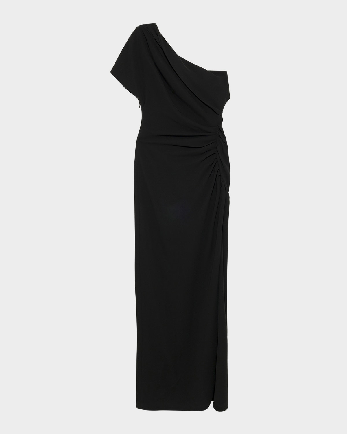The "Kally" gown from SIMKHAI is finished with soft drapes and waist pleats, enhancing the figurehugging form for a modern, yet timeless, touch Approx. 58.5"L from shoulders to hem Oneshoulder neckline Short sleeves Thighhigh side slit Full length Column silhouette Invisible side zipper Rayon/cellulose acetate/polyester Dry clean Imported
