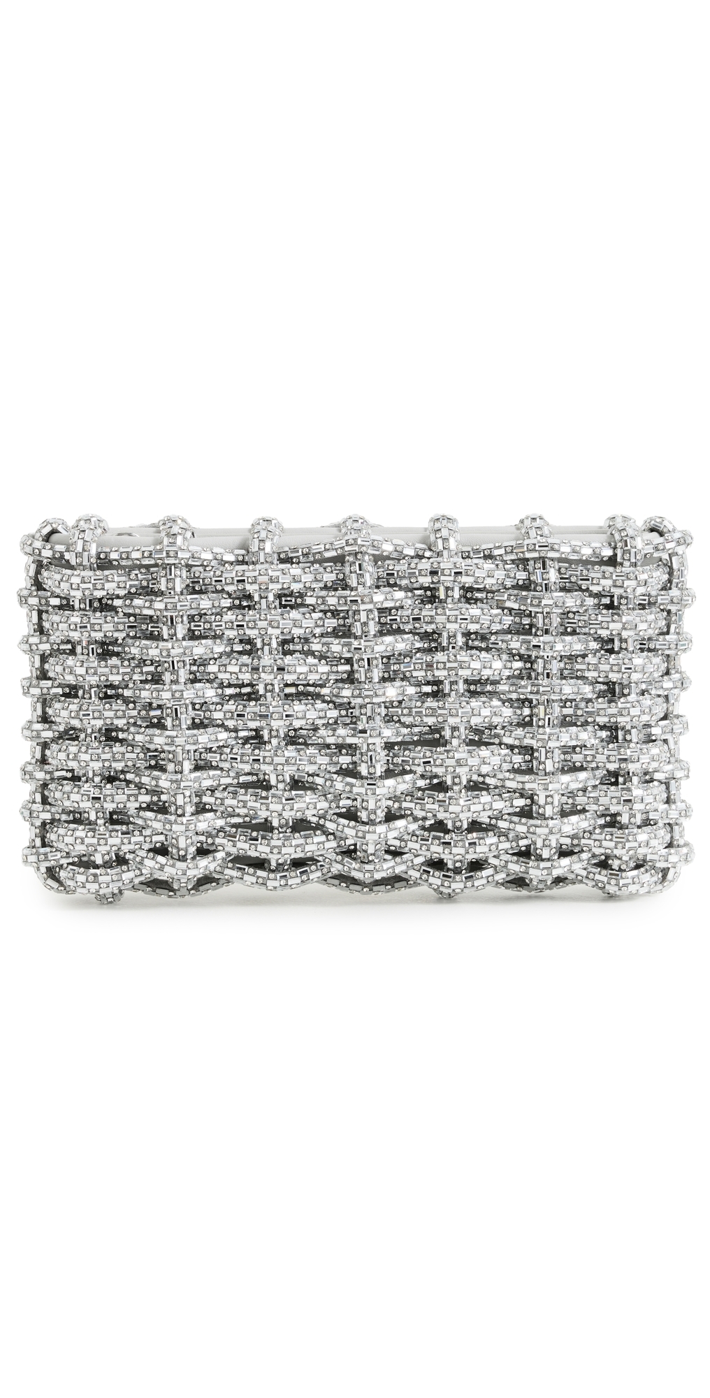 Sequined weave. Woven design. Allover rhinestone embellishments. Leather trim. Zip closure. Card slots at interior. Optional strap. Lining: Microfiber. Weight: 19oz / 0.54kg. Imported, China. Measurements: Height: 5.5in / 14cm Length: 10.25in / 26cm Depth: 1.5in / 4cm Strap drop: 15in / 38cm
