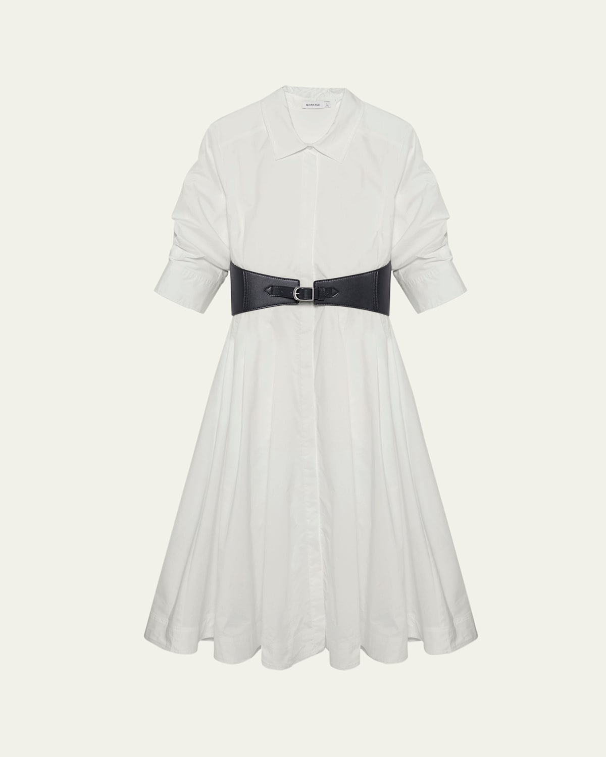 SIMKHAI "Olson" cottonblend midi dress elevated with a wide belted waist Point collar Elbowlength sleeves with button cuffs Shirtdress silhouette Hem falls below the knee Concealed buttonfront Cotton/polyester Dry clean Imported