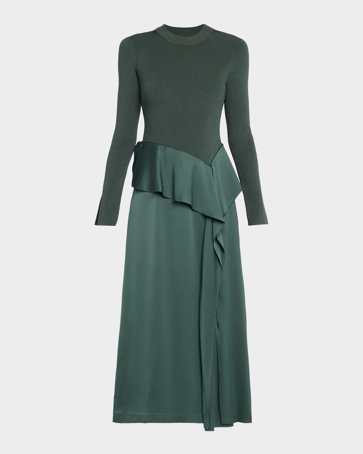 This "Ornella" midi dress from SIMKHAI combines a knit bodice with a fluid satin skirt, detailed with a cascading drape for a flutter of femininity Jewel neckline Long sleeves Split cuffs Hem falls below the knee Aline silhouette Invisible side zipper Rayon/cellulose acetate/elastane Dry clean Imported